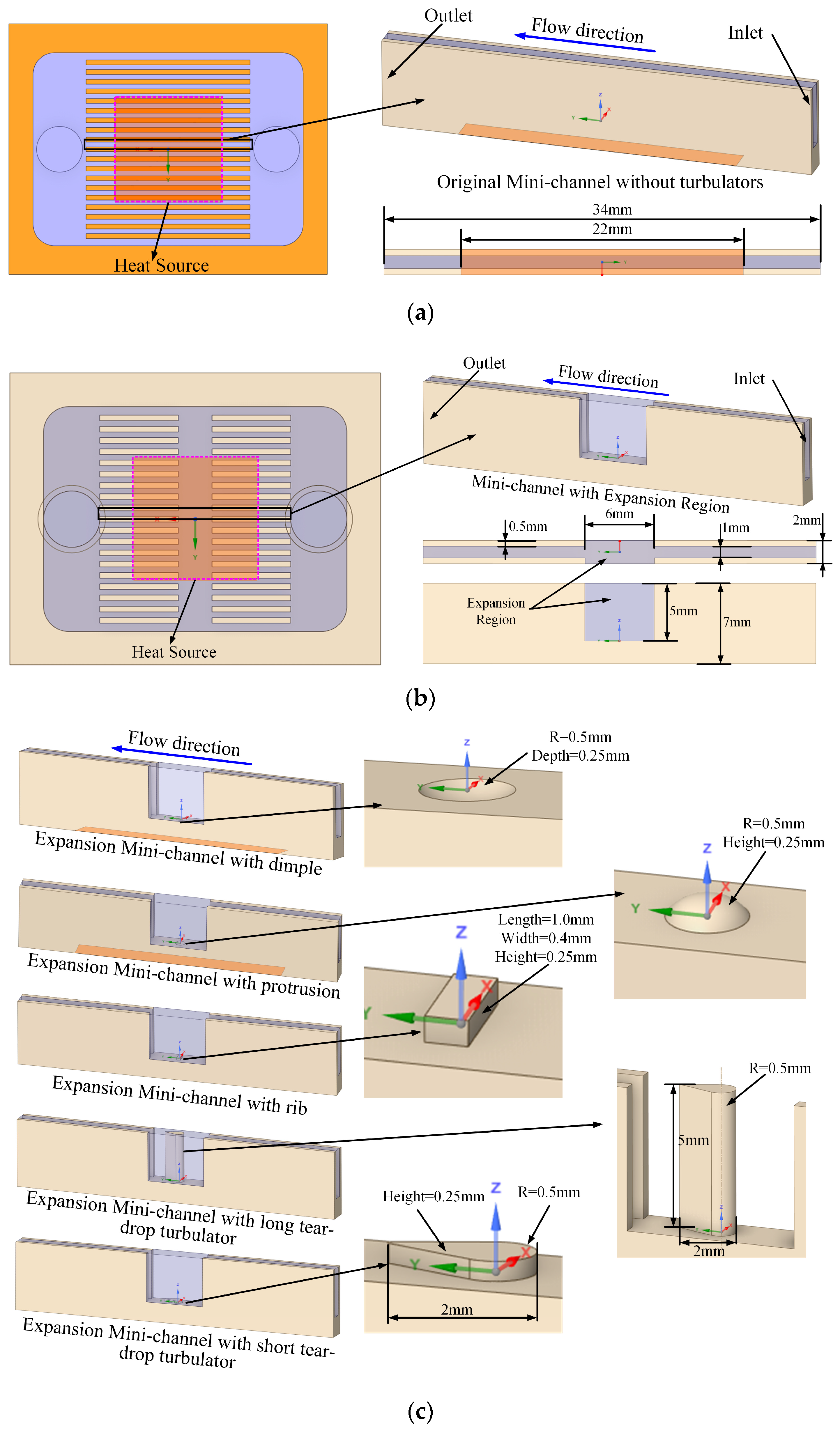 - For microchannels with an expansion region, turbulator designs that induce highly symmetric flow fields are preferable. The long teardrop turbulator, which effectively constricts the flow passage to increase coolant velocity and enhance heat transfer, improved thermal performance by 13.8–25.9% compared to other configurations.