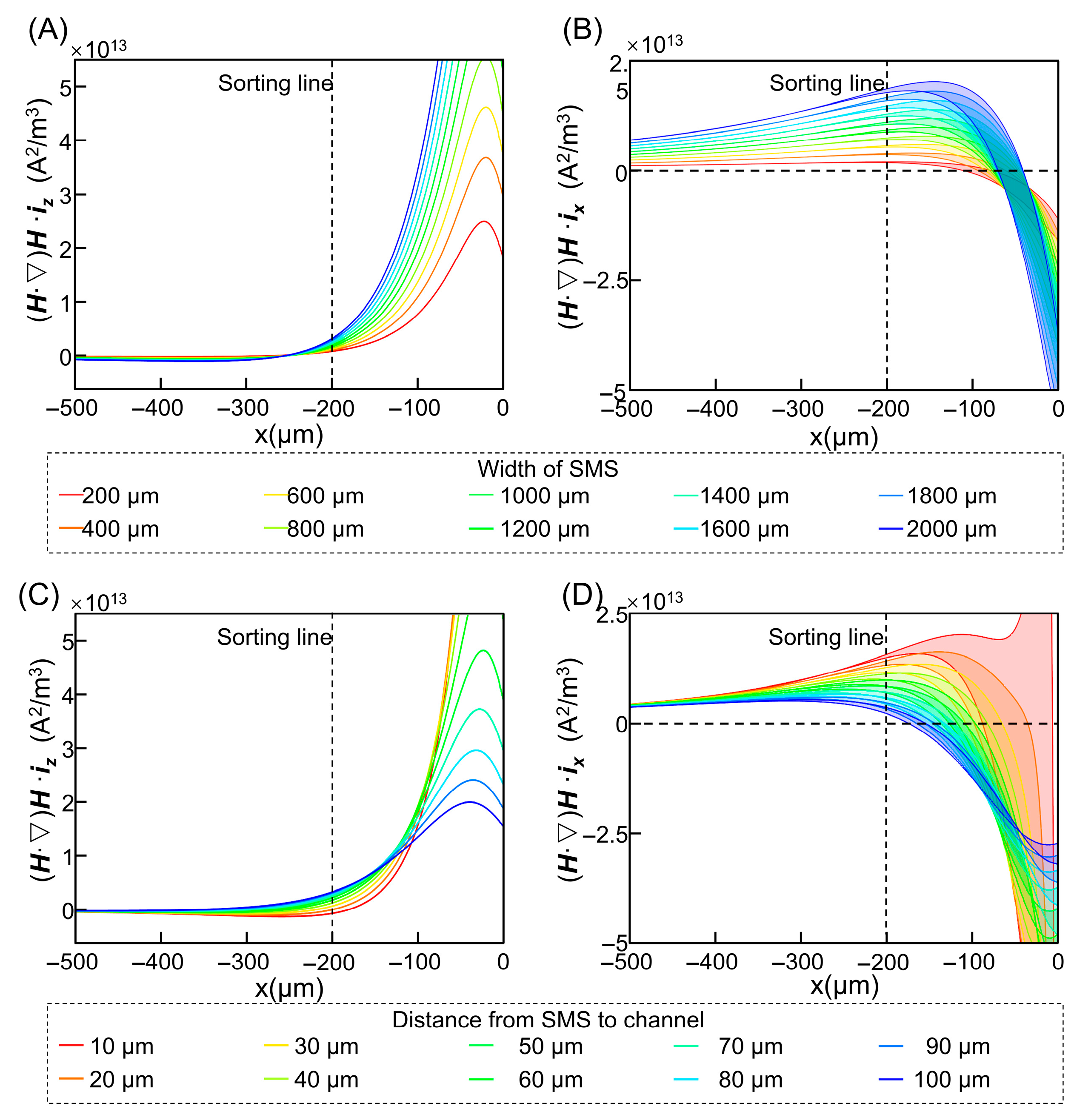 Figure 3. Influence of SMS parameters on force distribution: (A) Vertical components of (H·∇)H vs. strip width. (B) Horizontal components of (H·∇)H vs. strip width. (C) Vertical components of (H·∇)H vs. vertical distance D. (D) Horizontal components of (H·∇)H vs. vertical distance D.