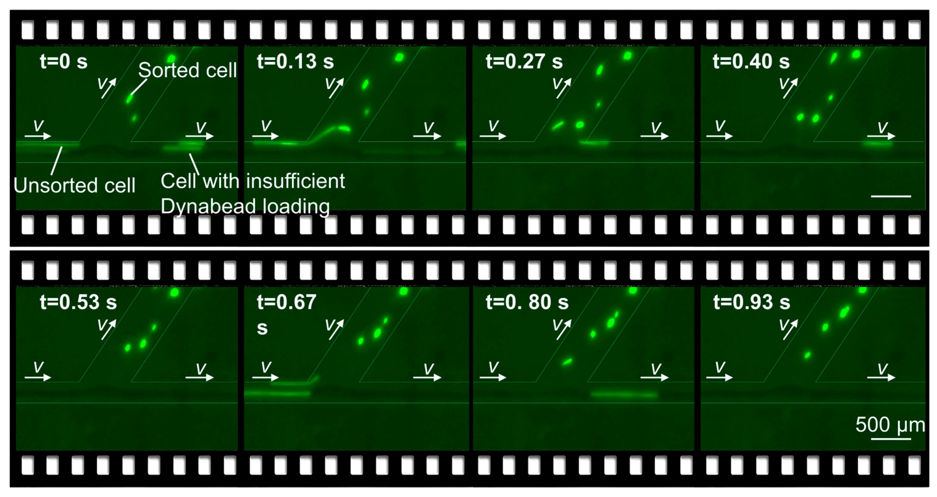 Figure 5. Fluorescence images of MCF-7 cells undergoing magnetic deflection and outlet collection in the continuous-flow chip. The main channel runs from left to right with lateral branch channels positioned centrally. During the sorting process, cells meeting the Dynabead loading threshold are directed into the branch channels, while cells with insufficient magnetic loading continue along the main channel toward subsequent magnetic control positions.