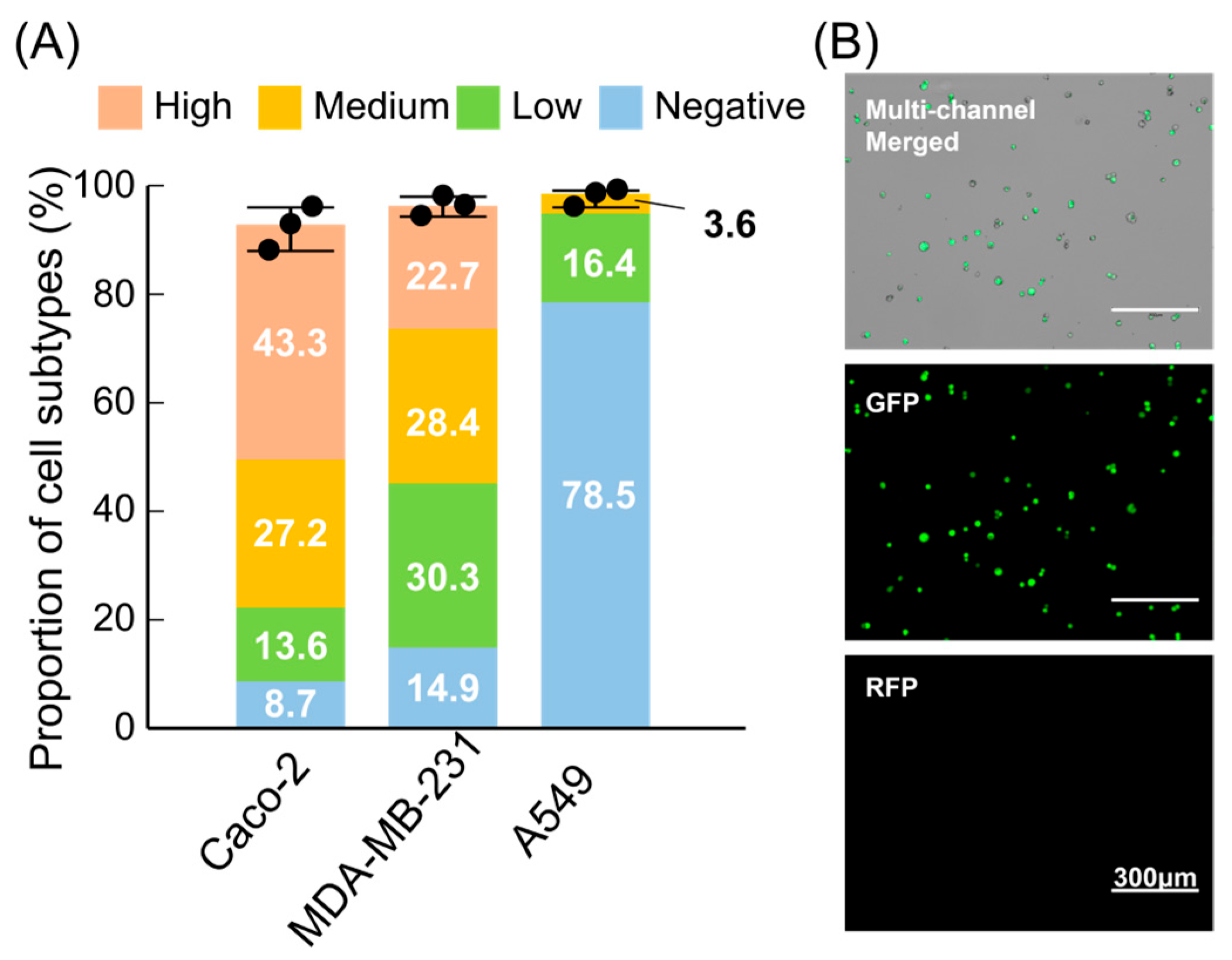 Figure 6. Benchmarking EpCAM expression-level fractionation across three epithelial cancer cell lines: (A) Outlet-resolved distributions of Caco-2, MDA-MB-231, and A549 cells (n = 3 per line). Bars indicate the relative proportions of high (H), medium (M), low (L), and near-negative (N) expression-level groups, as defined by the dominant outlet for each fraction. Distinct patterns across the three lines reflect their known EpCAM expression differences and reveal intra-line heterogeneity, including an EpCAM-low/negative subset within Caco-2. (B) Representative post-sorting viability assessment (MDA-MB-231) based on Calcein-AM/PI staining. The yield-weighted post-sorting viability was 98.0 ± 1.4% (n = 3); the corresponding viability retention Vpost/Vpre was 98.2 ± 1.3% (n = 3).