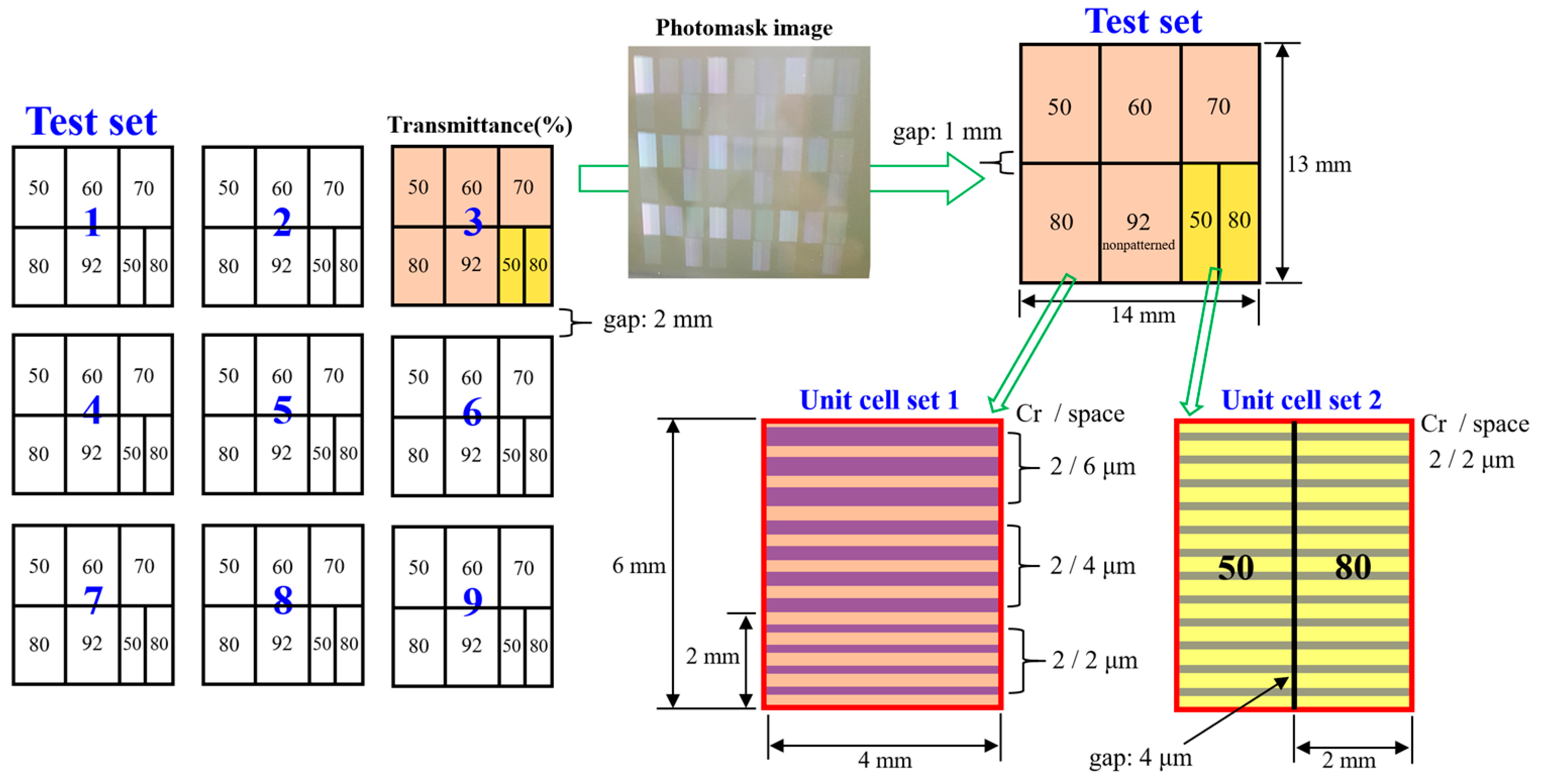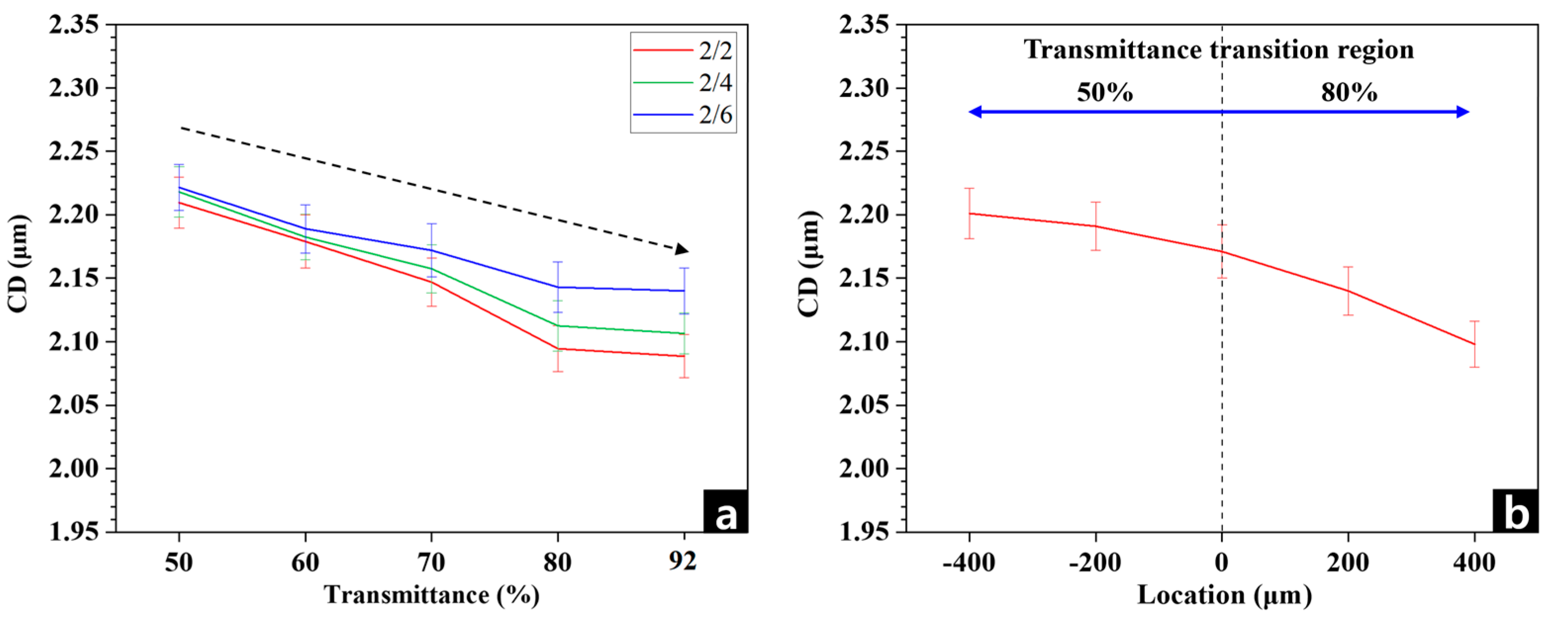 | Transmittance (%) | CD/Space (μm) | Location (μm) | CD (μm) | ||
