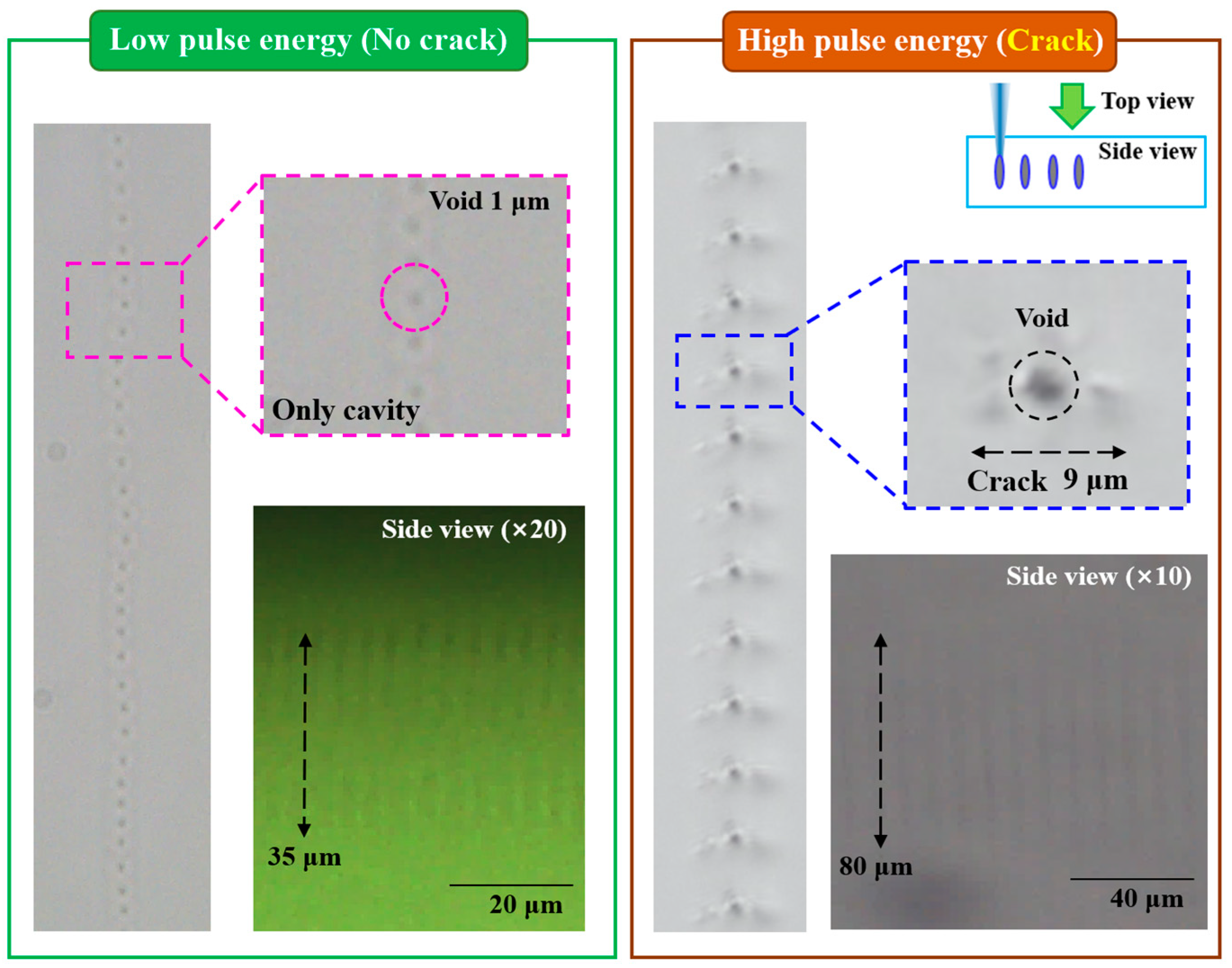 3.1. Laser-Induced Void Pattern Characteristics