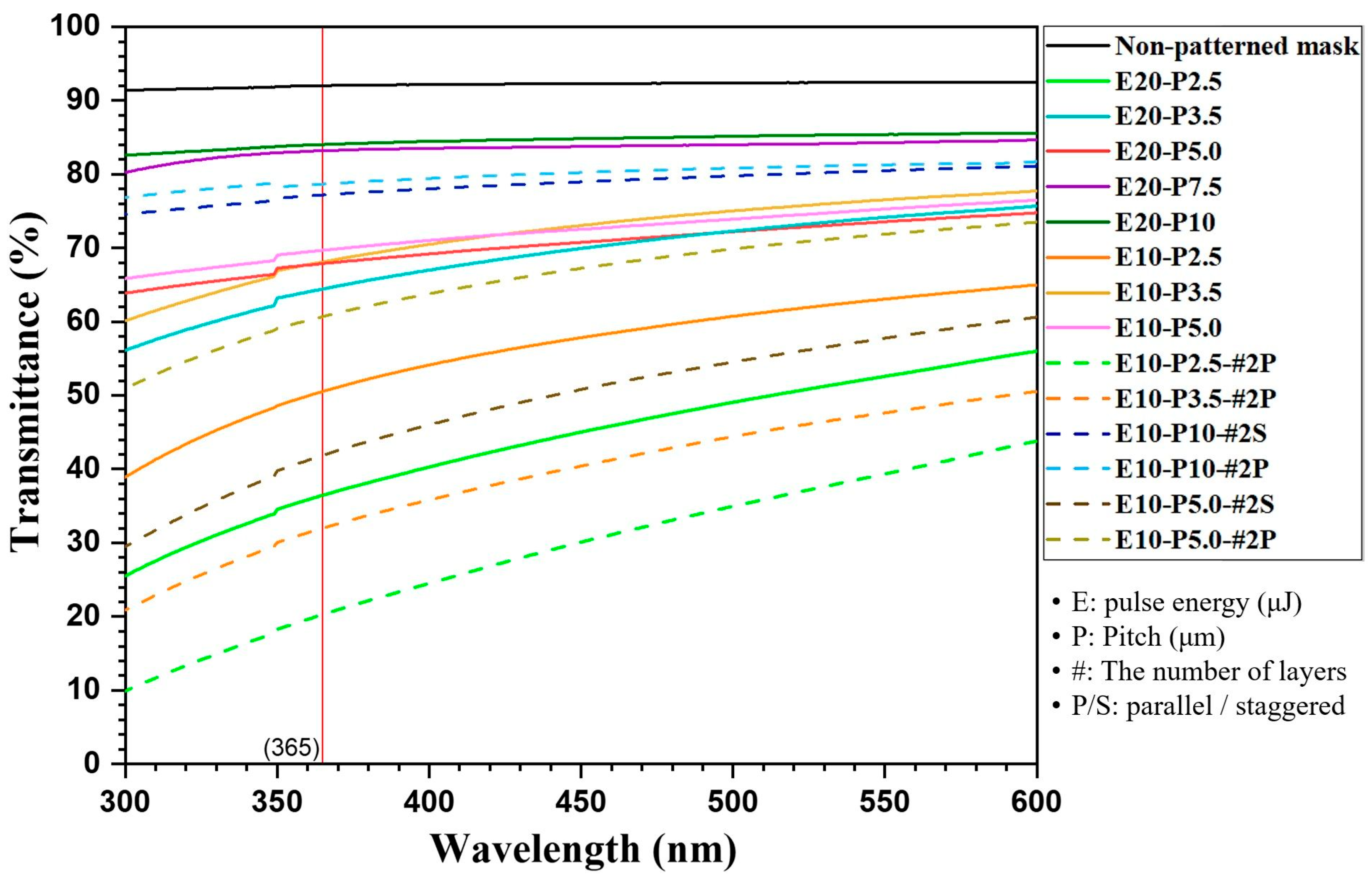 | Experimental Parameters | Pulse Energy (μJ) | Layer # | Pattern Arrangement | Pitch (μm) | Transmittance (%, at 365 nm) | Application of Laser Patterning Condition for Lithography | |