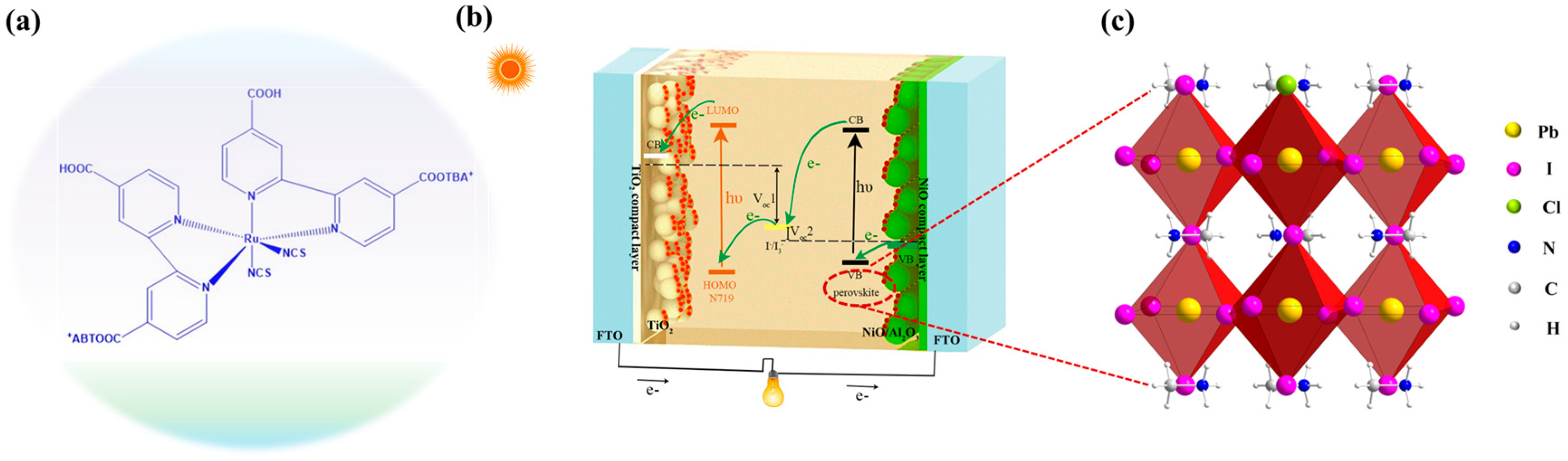 - Zhou, H.; Aftabuzzaman, M.; Masud; Kang, S.H. Key Materials and Fabrication Strategies for High-Performance Dye-Sensitized Solar Cells: Comprehensive Comparison and Perspective. ACS Energy Lett. 2025, 10, 881–895. [Google Scholar] [CrossRef]