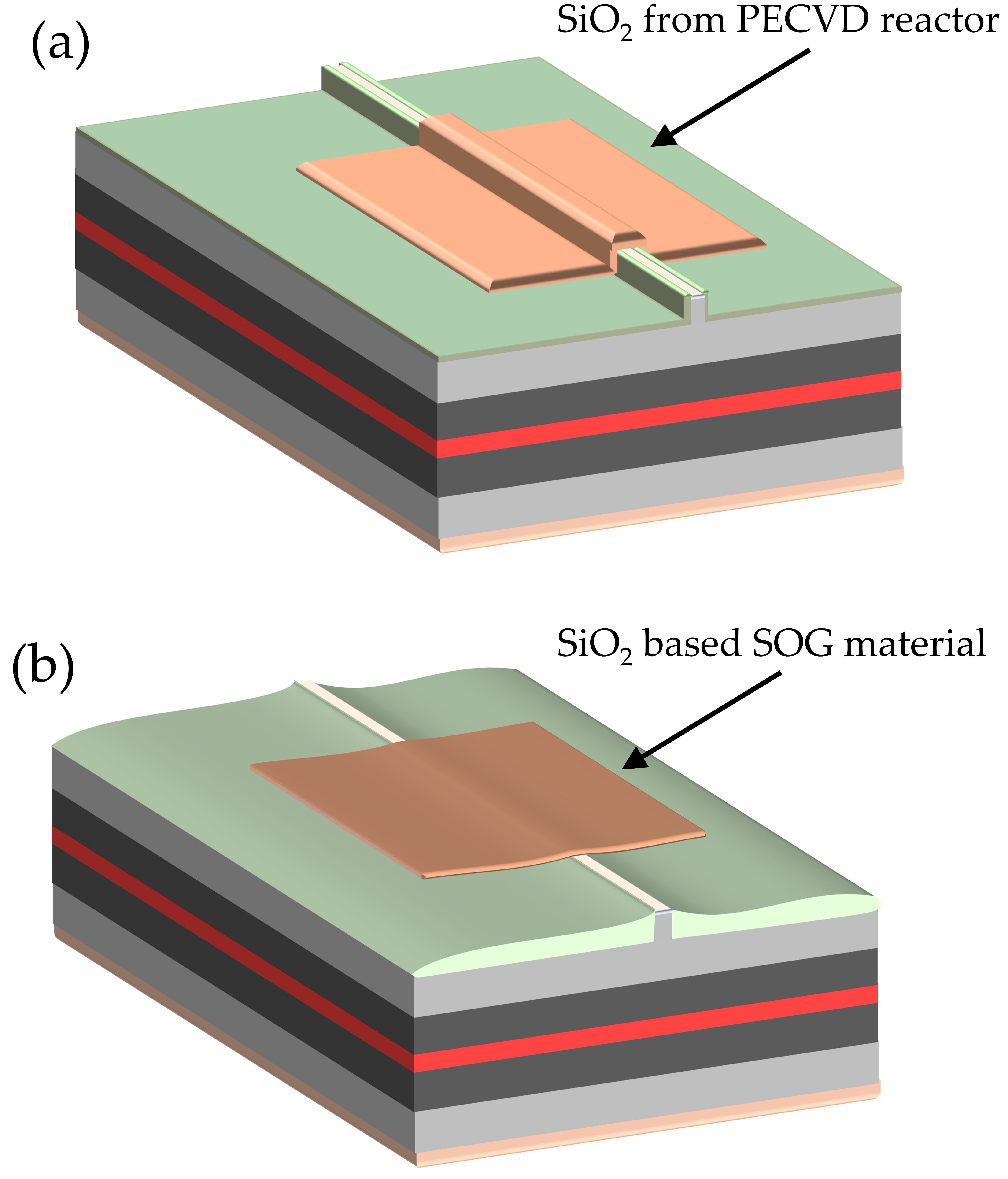 Figure 1b). Upon thermal curing, SOG forms a robust, low-k dielectric that is fully compatible with standard lithographic and etching processes. Unlike PECVD oxides, SOG processing avoids exposure to high-energy plasma, thereby minimizing damage to sensitive layers within the laser structure.