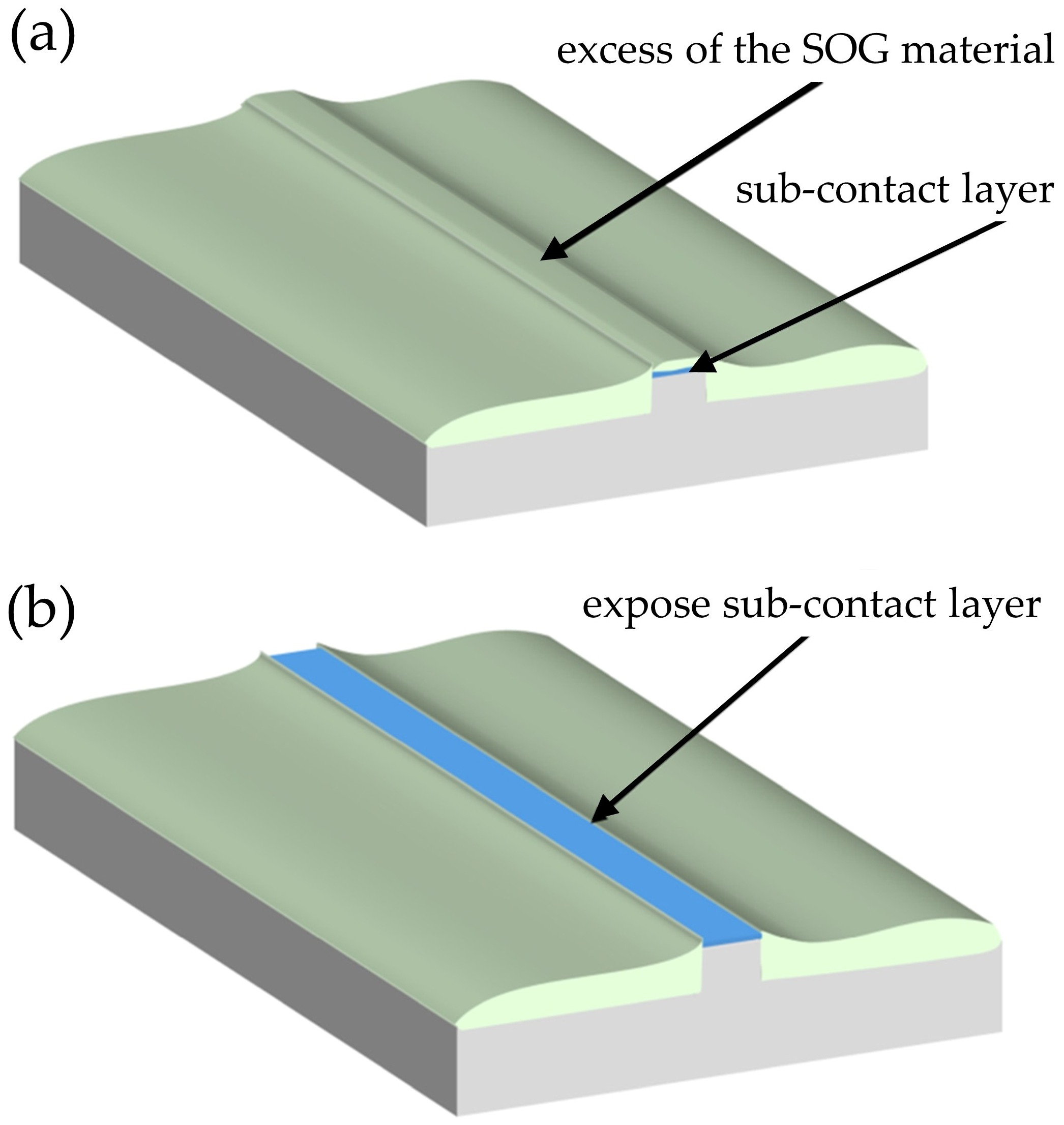 A second major challenge arises from the inability to employ the conventional self-aligned process in which the metal contact is deposited directly on top of the ridge and serves to protect the p-GaN sub-contact layer during etching. In the present approach, this strategy is not applicable because the optimized SOG fabrication procedure requires a final annealing step at 425 °C. Since oxygen availability is essential for proper ohmic contact formation [