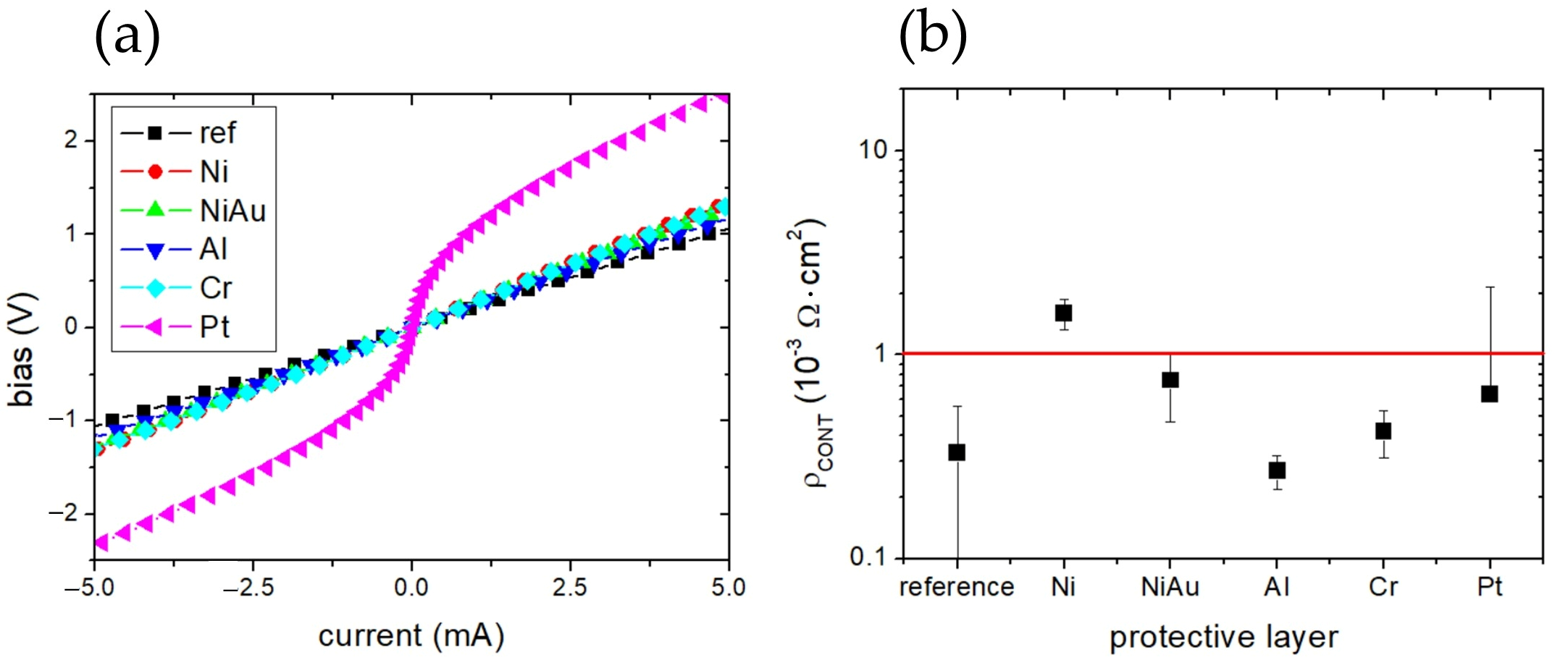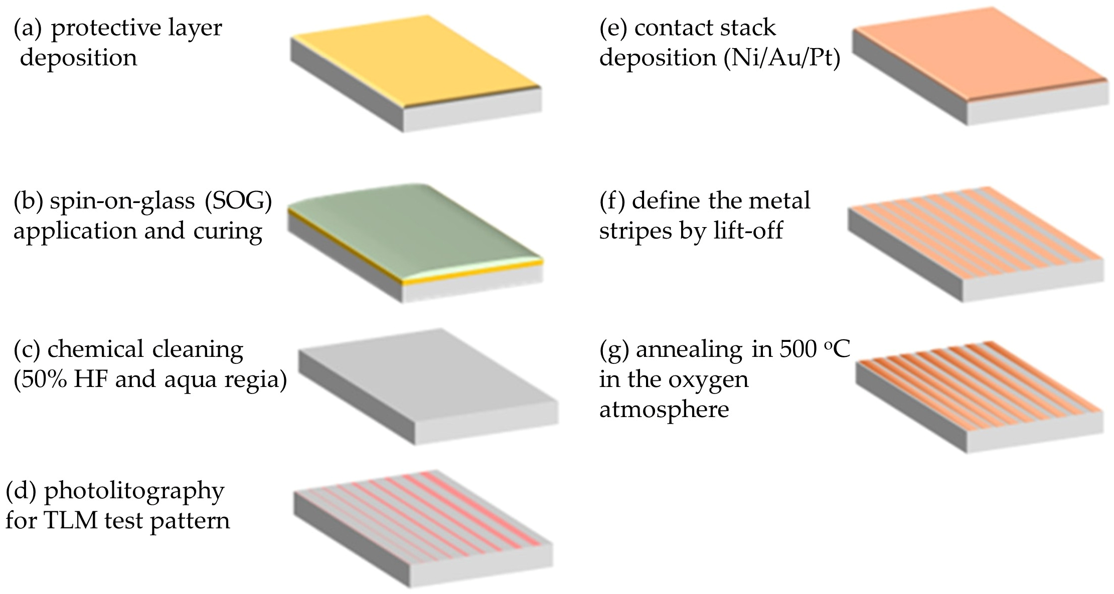 To identify the most suitable material for this protective function, we investigated a set of metal layers, including Ni, Al, Cr, Pt, and a Ni/Au bilayer. The performance of each candidate was evaluated by measuring the electrical properties of the resulting metal contacts using the transfer length method (TLM) after removal of the protective layer. A key requirement was that the presence and subsequent removal of the protective material must not degrade the final device parameters. In addition, the ease and cleanliness of protective-layer removal were assessed. The ideal metal mask for the p-GaN sub-contact layer should exhibit a low etch rate in SF6 plasma, be readily removable after oxygen-limited SOG annealing, and show no detrimental chemical interaction with GaN.
