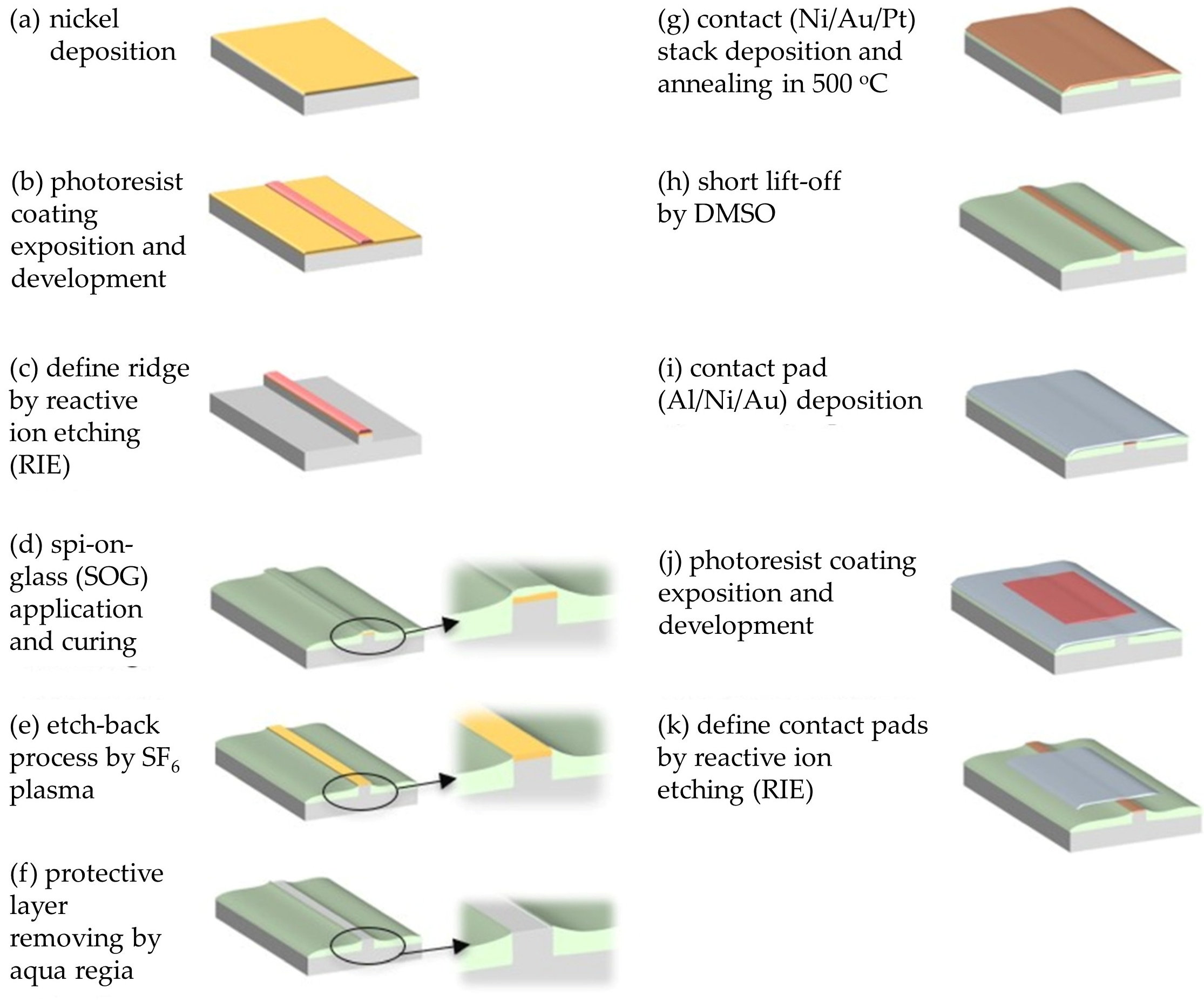 Figure 5k), followed by resist removal. On the backside, the wafer was thinned to approximately 100 µm and metallized with a Ti/Al/Au contact stack. After completion of processing, the wafer was cleaved and diced, and individual laser chips were mounted in TO-56 packages. The fabricated devices had a ridge width of 3 µm and a resonator length of 750 µm.