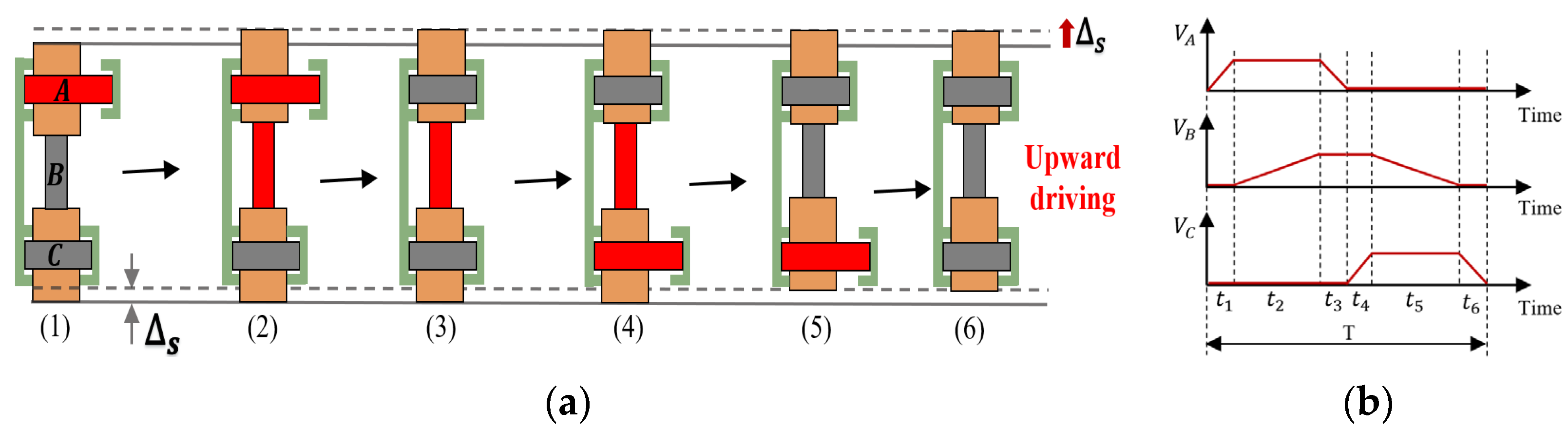 - Ma, X.; Liu, Y.; Deng, J.; Zhang, S.; Liu, J. A walker-pusher inchworm actuator driven by two piezoelectric stacks. Mech. Syst. Signal Process. 2022, 169, 108636. [Google Scholar] [CrossRef]