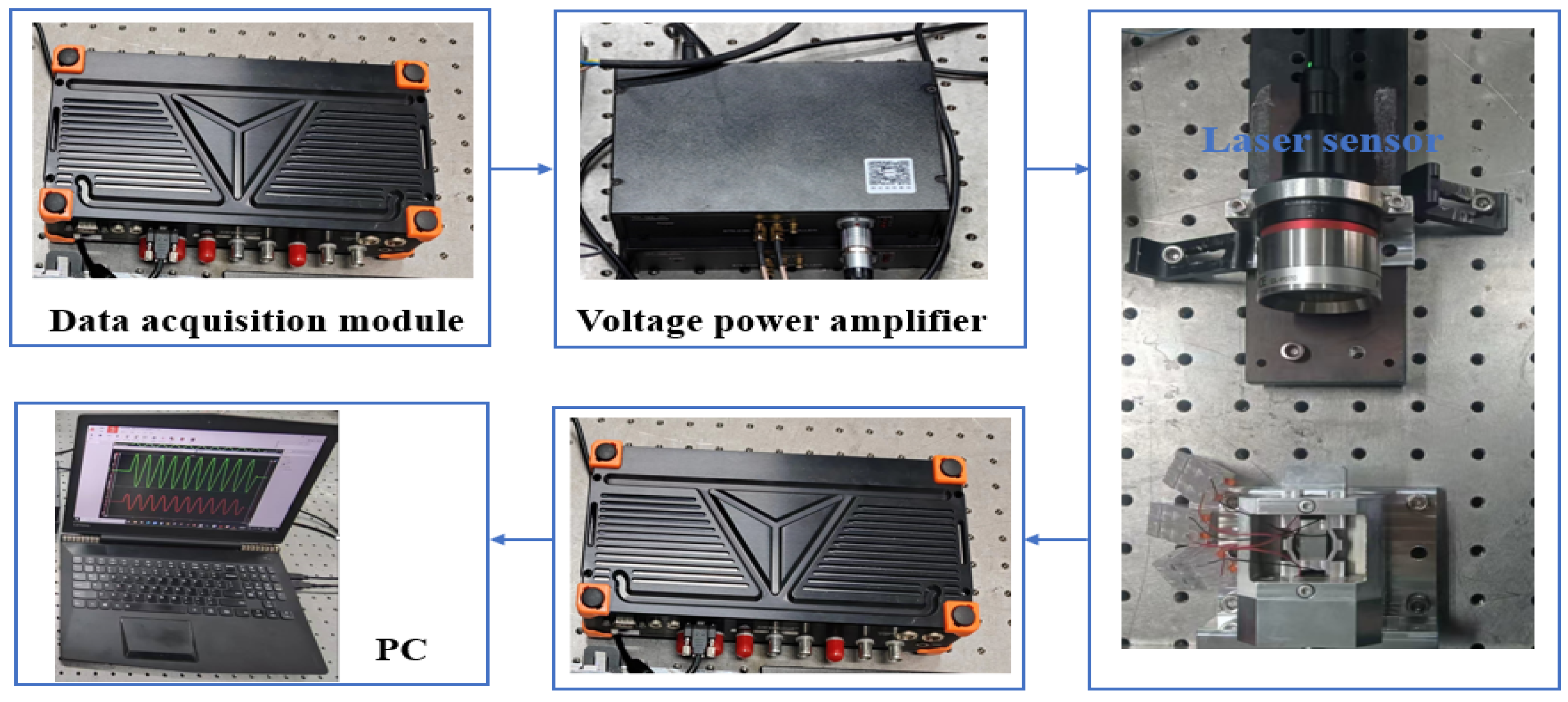 - PZT-B generates controlled micro-displacement when driven by a voltage-modulated sinusoidal waveform, enabling precise motion regulation through electrical input adjustment.