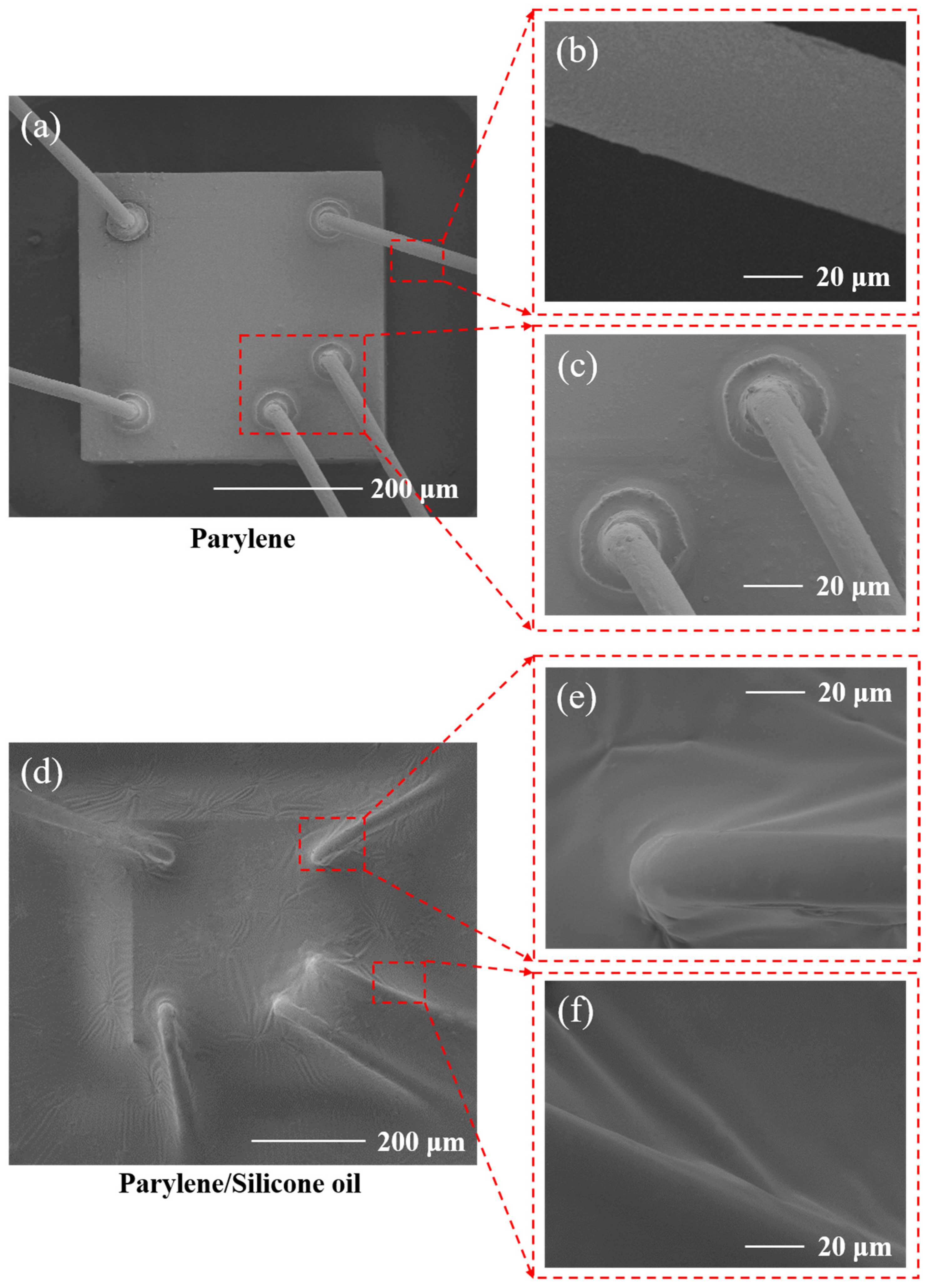 - Yao, J.L.; Qiang, W.J.; Guo, X.Q.; Fan, H.; Zheng, Y.; Xu, Y.; Yang, X. Defect Filling Method of Sensor Encapsulation Based on Micro-Nano Composite Structure with Parylene Coating. Sensors 2021, 21, 1107. [Google Scholar] [CrossRef]