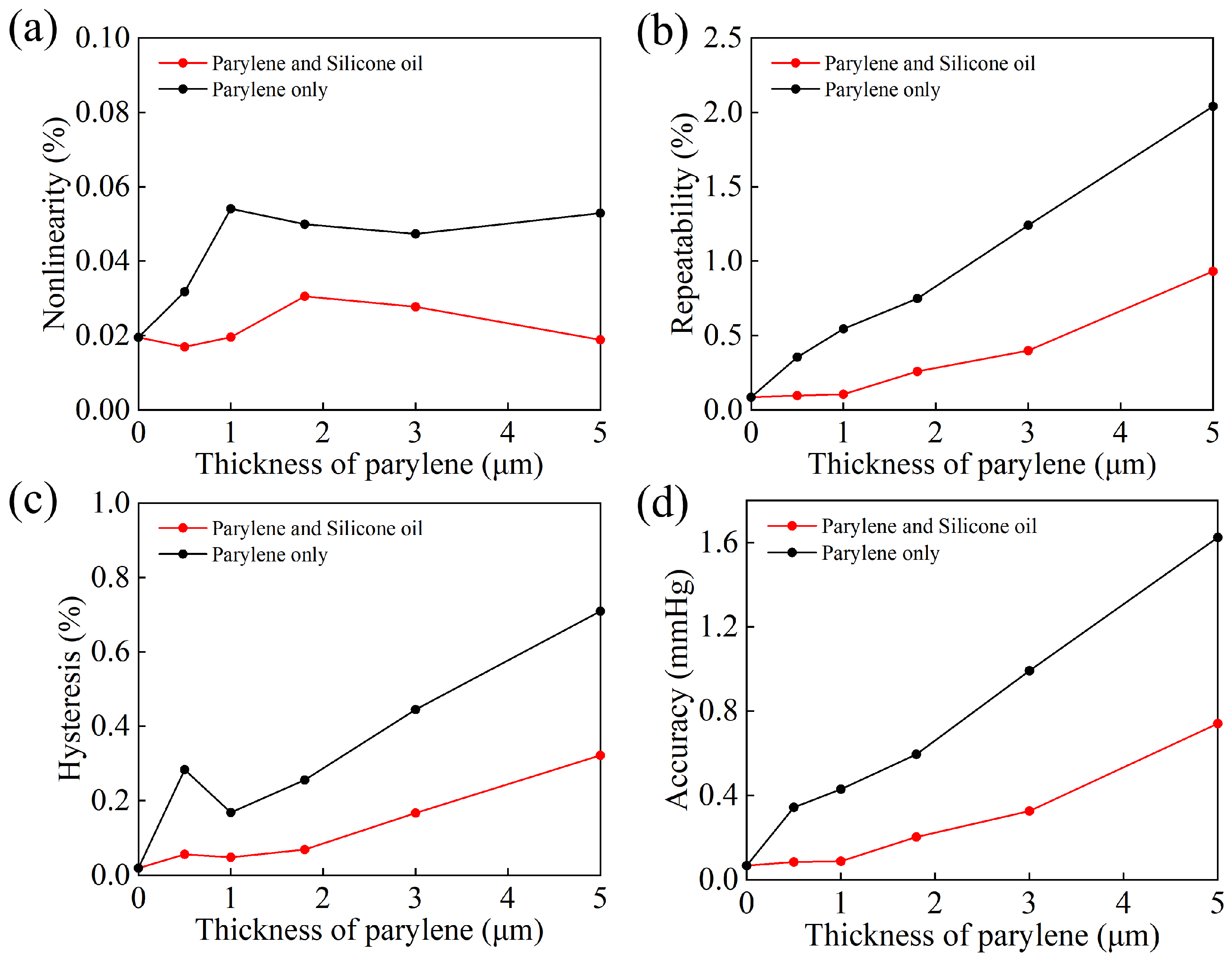 - Zhao, K.; Yuan, Y.; Wang, S.K.; Cui, L. Effect of Parylene Coating on the Performance of Implantable Pressure Sensor. IEEE Sens. J. 2024, 24, 24593–24599. [Google Scholar] [CrossRef]