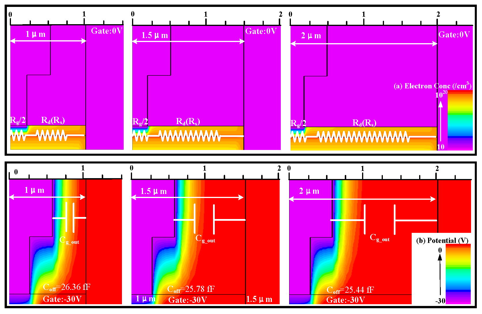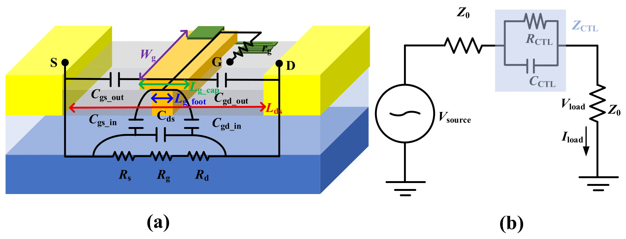- Chang, S.; Jeong, H.; Jung, H.; Choi, S.; Choi, I.; Noh, Y.; Kim, S.; Lee, S.; Ahn, H.; Kang, D.M.; et al. Effects of Parasitic Gate Capacitance and Gate Resistance on Radiofrequency Performance in LG = 0.15 Μm GaN High-electron-mobility Transistors for X-band Applications. ETRI J. 2024, 46, 1090–1102. [Google Scholar] [CrossRef]