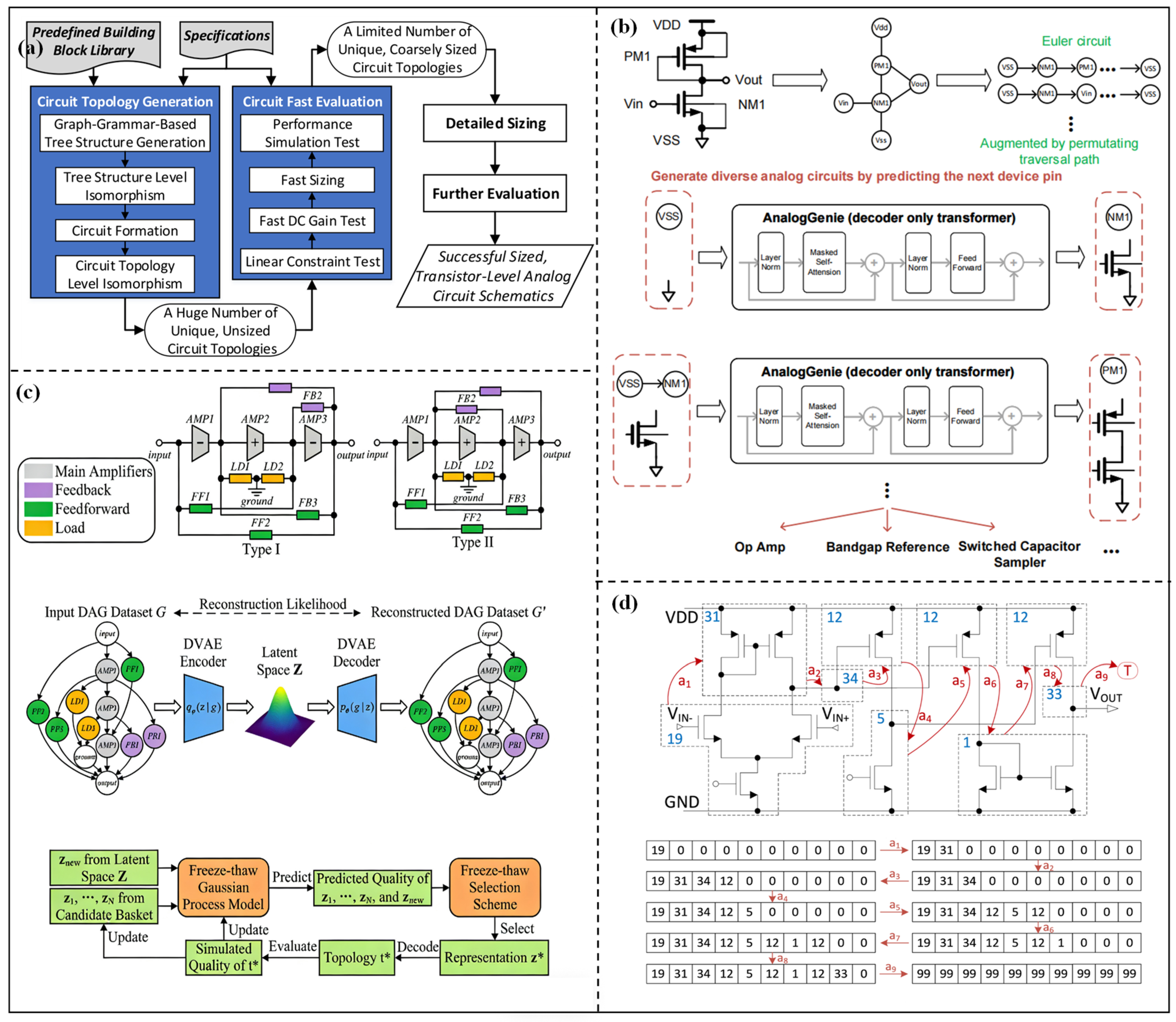 - Gao, J.; Cao, W.; Yang, J.; Zhang, X. AnalogGenie: A Generative Engine for Automatic Discovery of Analog Circuit Topologies. In Proceedings of the International Conference on Representation Learning, Singapore, 24 April–28 April 2025; pp. 96496–96514. [Google Scholar]