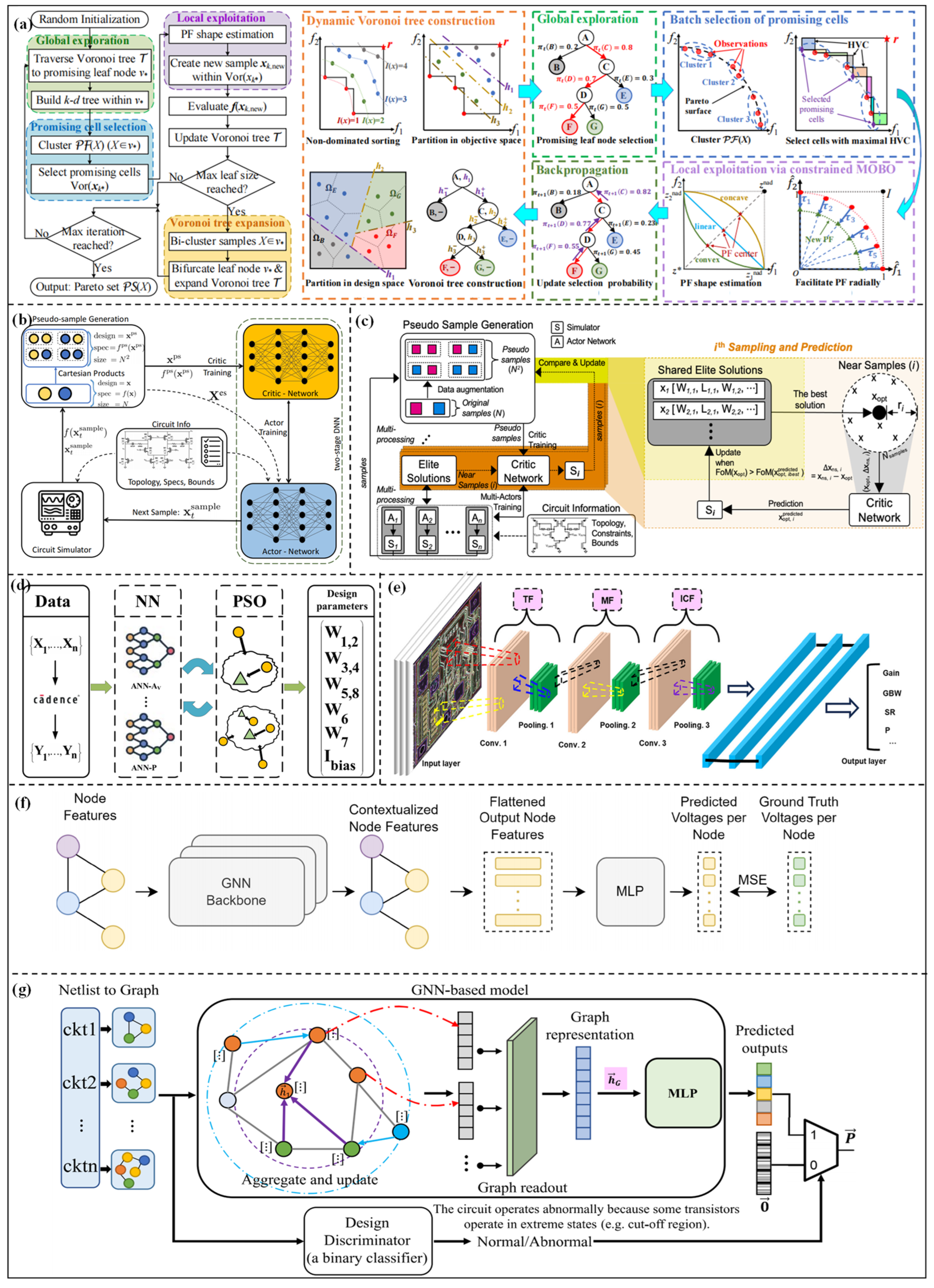 - Zhao, A.; Lyu, R.; Zhao, X.; Bi, Z.; Yang, F.; Yan, C.; Zhou, D.; Su, Y.; Zeng, X. VTSMOC: An Efficient Voronoi Tree Search Boosted Multi-objective Bayesian Optimization with Constraints for High-dimensional Analog Circuit Synthesis. IEEE Trans. Comput.-Aided Des. Integr. Circuits Syst. 2025, 44, 818–831. [Google Scholar] [CrossRef]