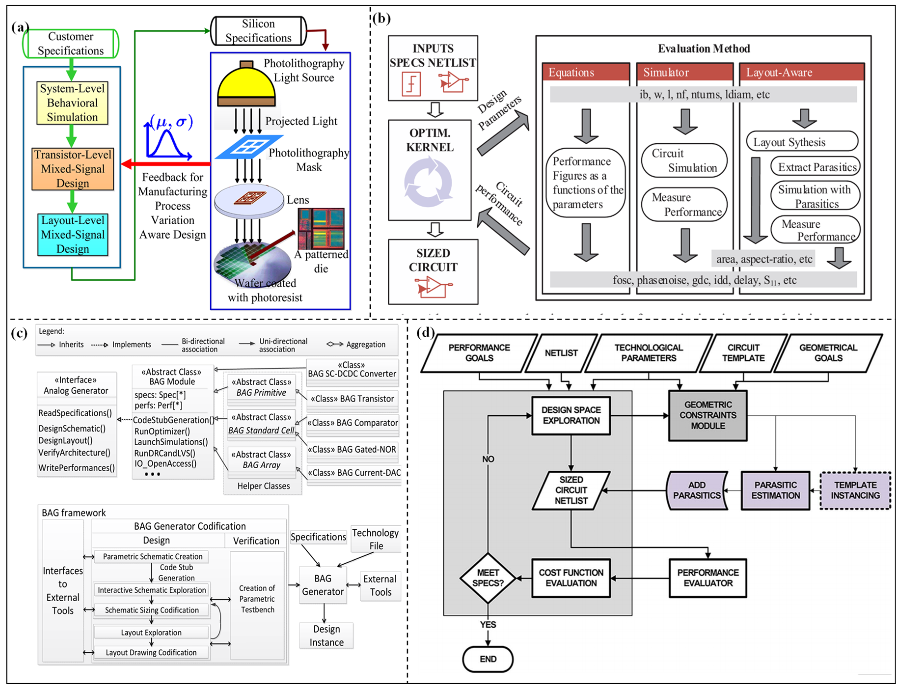 - Crossley, J.; Puggelli, A.; Le, H.-P.; Yang, B.; Nancollas, R.; Jung, K.; Kong, L.; Narevsky, N.; Lu, Y.; Sutardja, N.; et al. BAG: A Designer-Oriented Integrated Framework for the Development of AMS Circuit Generators. In Proceedings of the 2013 IEEE/ACM International Conference on Computer-Aided Design (ICCAD), San Jose, CA, USA, 18–21 November 2013; pp. 74–81. [Google Scholar]