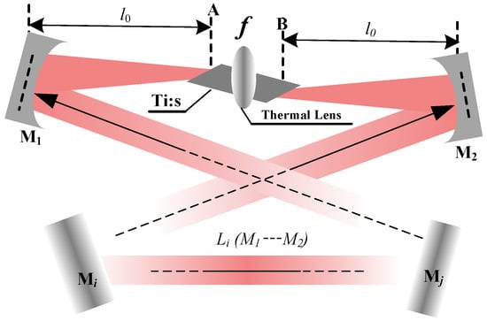 To eliminate the spatial hole-burning effect, the four-mirror or multi-mirror ring resonator is typically adopted, as depicted in Figure 1. Meanwhile, owing to the inherently short fluorescence lifetime of the Ti:sapphire gain medium, the crystal must be precisely located at the intracavity beam waist between two concave mirrors ( and ) to ensure a pump intensity high enough to initiate and sustain laser action. Operation at the gain edge, characterized by a small stimulated emission cross-section, inevitably induces pronounced thermal loading. Then, the thermal effects of the Ti:S crystal can be accurately modeled as a thermal lens with the focal length of f. In the resonator layout, A and B mark the front and rear facets of the Ti:S crystal, respectively, with the concave mirrors and positioned at a distance of from each facet. The remaining cavity mirrors (… ) are all planar, defining an optical path length of . Notably, the beam waist size within the crystal and the overall stability regime of the resonator exhibit minimal sensitivity to variations in . Consequently, the present analysis is centered on the impact of the equivalent thermal lens focal length f and the distance on the operational characteristics of the resonator.