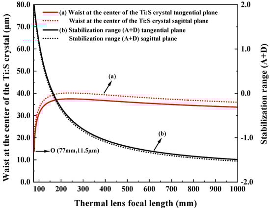 Then, the sensitivity of the designed resonator to the thermal effect was evaluated, and the results are shown in Figure 4. Obviously, for the thermal focal length above 200 mm, as the thermal focal length shortens, the beam waist became large. Once the thermal focal length was less than 200 mm, the beam waist decreased with the intensification of the thermal effect. Especially below 150 mm of the thermal focal length, the impact of the thermal effects on the resonator becomes more pronounced. It was clear that the resonator can tolerate a maximum equivalent thermal focal length of 77 mm (Point O).