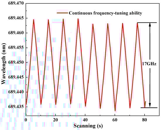 Furthermore, the continuous-frequency tuning of the generated 689 nm laser was recorded (WS6-761, High Finesse Laser and Electronic Systems, Tübingen, Germany) as in Figure 7 when the voltage applied to the PZT on was continuously modulated by a driver with a frequency of 0.05 Hz. It was observed that the continuous-frequency tuning range reached 17 GHz.