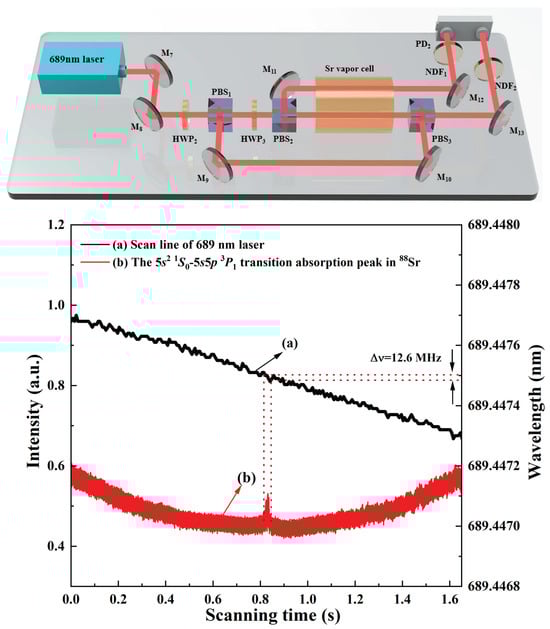 Based on this achieved 689 nm tunable laser source, a strontium atomic saturated absorption spectroscopy setup was constructed, which is shown in Figure 8. The strontium atomic vapor cell used in the experiment had a length of 50 cm and a clear aperture of 1.5 inches. To render the saturated absorption spectrum distinguishable from the background noise, the strontium vapor cell was heated to 610 °C using a nickel-chromium (NiCr) heating wire (305D , ZHAO XIN PS, Shenzhen, China) wrapped around the tube wall. The strontium source was positioned at the center of the cell to ensure uniform vapor distribution. An outer layer of thermal insulation material was applied to the cell to maintain stable temperature conditions, which is critical for minimizing thermal fluctuations and ensuring consistent spectral measurements. The 689 nm laser beam was split by a half wave plate ( and ) and polarizing beam splitter ( and ) into a strong pump laser , a weak probe laser , and a reference laser . and were aligned to counter-propagate through the strontium vapor-filled cell. The reference beam passes directly through the strontium vapor cell.