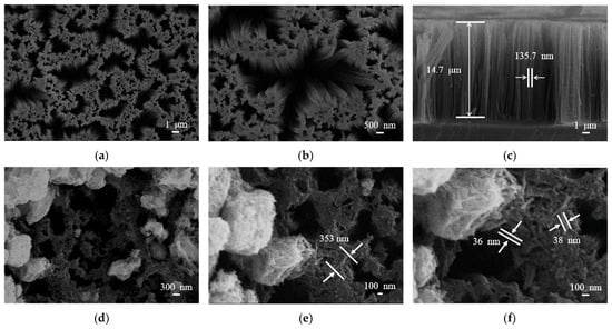 SEM images in Figure 4 provide morphological details of bare SiNWs and the WO3/SiNWs composite. The bare SiNWs (Figure 4a–c) present a vertically aligned porous network with smooth surfaces. Statistical analysis indicates an average length of ~14 μm and diameter of ~136 nm. After hydrothermal growth of WO3, the composite (Figure 4d–f) shows uniform coverage of the SiNWs scaffold by WO3 nanorods, which have an average length of ~350 nm and diameter of 35–40 nm. Notably, a fraction of the nanorods remain embedded within the porous SiNWs matrix, suggesting strong interfacial bonding between the two phases.