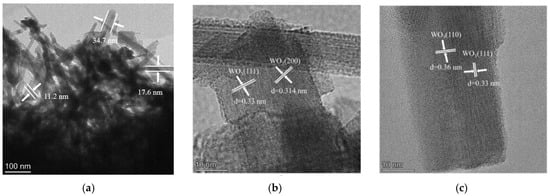 To gain deeper insight into the microstructure and crystal orientation, TEM and associated analyses were performed (Figure 5). Figure 5a shows stacked nanorods with average dimensions of ~350 nm (length) and 11~35 nm (width). High-resolution TEM images (Figure 5b,c) reveal clear lattice fringes with measured spacings of 0.33 nm, 0.314 nm, and 0.36 nm, which match the (111), (200), and (110) planes of hexagonal WO3, respectively. These observations confirm that the WO3 nanorods grow with well-defined crystallographic orientation and remain structurally coherent. The SAED pattern in Figure 5d exhibits concentric rings composed of sharp diffraction spots. The discrete spots are attributed to single-crystalline silicon, whereas the continuous rings correspond to polycrystalline WO3 and can be indexed to the (210), (222), (002), (004), and (224) planes of hexagonal WO3, consistent with XRD results. This diffraction signature collectively confirms the coexistence of highly crystalline Si and WO3 phases with distinct structural ordering.
