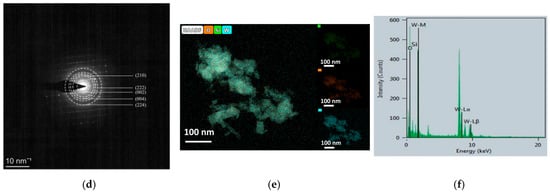TEM analysis of WO3/SiNWs: (a) low-magnification overview, (b,c) high-resolution images at 1,050,000× showing lattice fringes and (d) corresponding SAED pattern, (e) elemental analysis of HAADF-STEM image and (f) EDS spectrum.