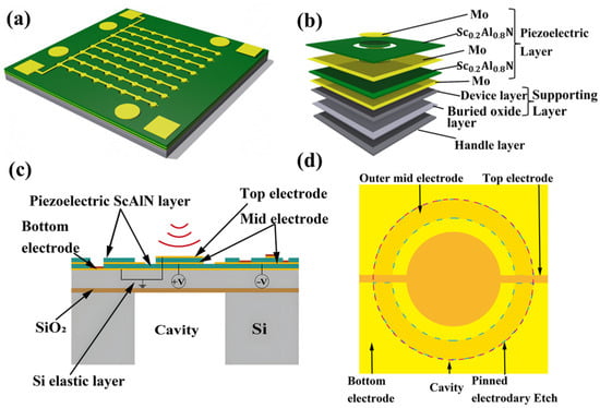 The system studied the effects of geometric structure, AlN thickness and electrode shape on the performance of the hydrophone. Figure 1a shows the schematic diagram of an 8 × 8 array of hydrophones. As shown in Figure 1b, a single cell is composed of a piezoelectric layer (Mo-Sc0.2Al0.8N-Mo-Sc0.2Al0.8N-Mo), supporting layer and handle layer. The cross-sectional and top views are depicted in Figure 1c and Figure 1d, respectively.