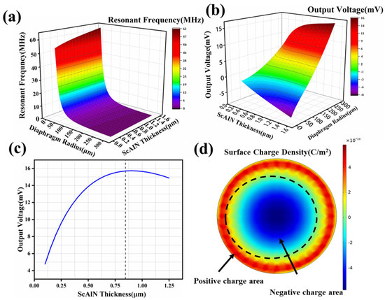 (a) Resonant frequency versus film radius and ScAlN layer thickness; (b) output voltages versus film radius and ScAlN layer thickness; (c) relationship between the thickness of ScAlN and the output voltage; (d) hexagonal membrane surface charge density distribution.