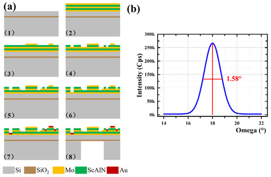 (a) Fabrication process of the ScAlN-based hydrophone; (b) X-ray diffraction (XRD) spectra of the ScAlN film.