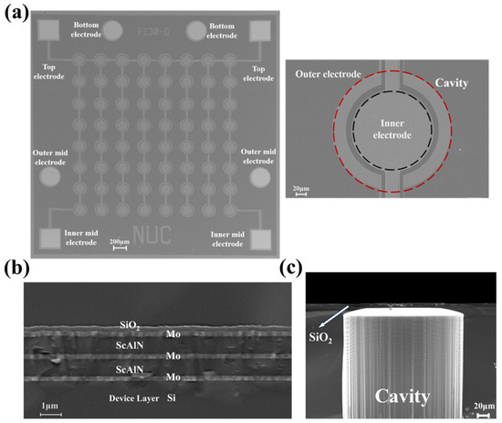 Figure 4a shows the array and unit scanning electron microscope (SEM) images captured using the TESCAN MIRA3. The sensing film is predominantly composed of a Mo/Sc0.2Al0.8N/Mo/Sc0.2Al0.8N/Mo with thickness values of 0.2 μm/0.8 μm/0.2 μm/0.8 μm as shown as Figure 4b. Additionally, Figure 4c is the cross-sectional view of the cavity following deep reactive ion etching (DRIE), featuring a back cavity thickness of 300 μm etched to the SiO2 stop layer. Notably, a residual 6.13 μm of Si at the bottom edge remains unetched, as further etching could potentially damage the vibrating membrane.