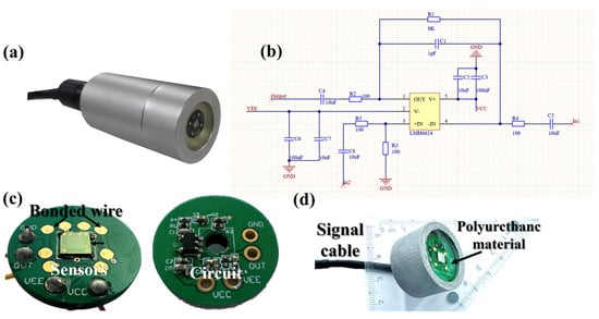 Encapsulation structure of the MEMS hydrophone. (a) Encapsulated hydrophone; (b) electric schematics; (c) PCB with a MEMS hydrophone; (d) packaged hydrophone.