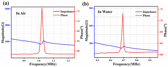 The impedance spectrum, which includes and values, is measured using the KEYSIGHT E4990A (Keysight Technologies, Santa Rosa, CA, USA) impedance analyzer. As depicted in Figure 6a, the first-order resonant frequency is about 1.015 MHz, and the anti-resonant frequency is about 1.03 MHz, with the electromechanical coupling coefficient calculated to be 3% according to (4). The performance of the hydrophone in deionized (DI) water is shown in Figure 6b. Due to the mass effect [28], the resonant frequency is reduced to 0.68 MHz and the anti-resonant frequency is approximately 0.7 MHz. The resulting effective electromechanical coupling coefficient is determined to be 5.64% in DI water.