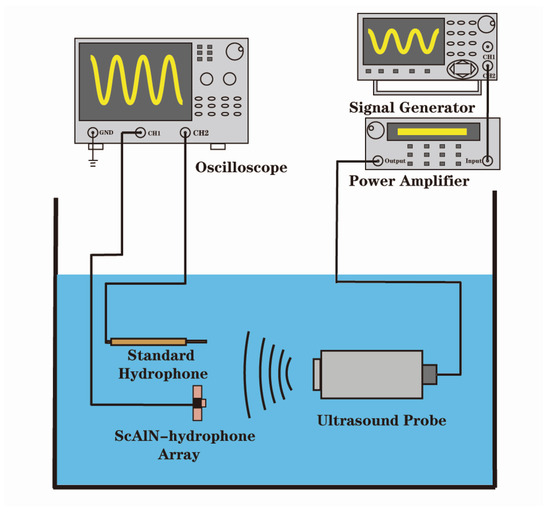 Figure 7 shows an underwater test platform. The emission transducer is motivated by the signal generator. Under constant sound pressure excitation, the sensitivity of the standard hydrophone is proportional to that of the test hydrophone , and this proportion is equal to the ratio of the output voltage of the standard hydrophone to that of the test hydrophone [29]: