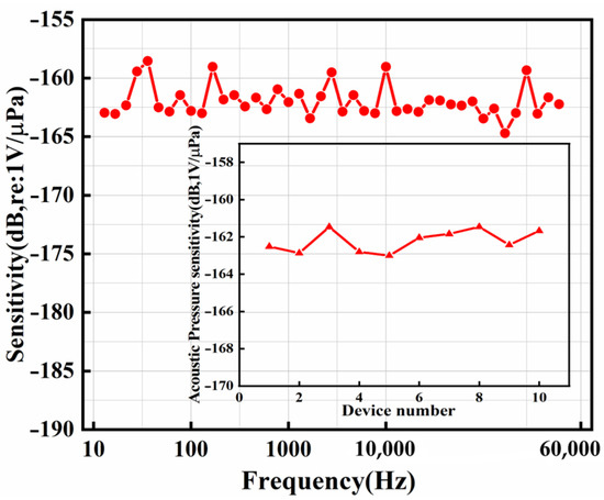 Sensitivity curve of the hydrophone under different frequencies. Sensitivity testing of multiple devices (inset).