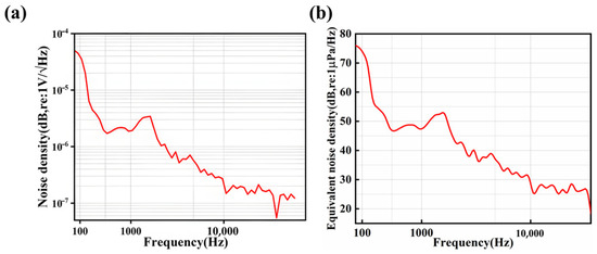 The main overall noise sources of the test include dielectric loss, input noise voltage and current of the preamplifier, as well asJohnson (thermal) noise [30]. The test is conducted using an Agilent 35670A dynamic signal analyzer. The measured noise resolution is shown in Figure 9a. There is a relationship between sound pressure sensitivity, noise density and equivalent noise resolution [20,30]: