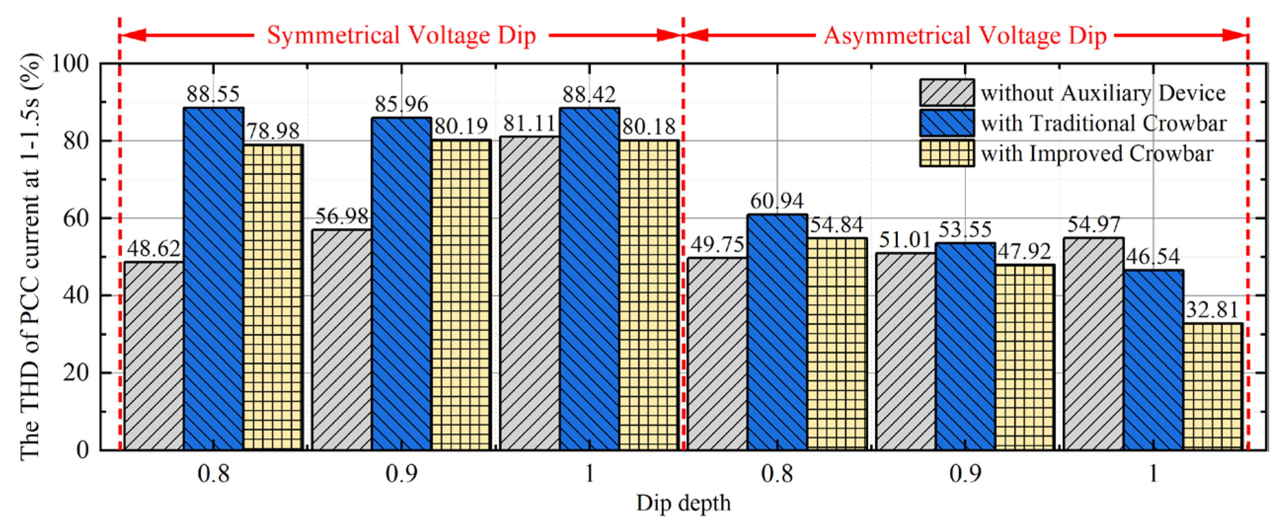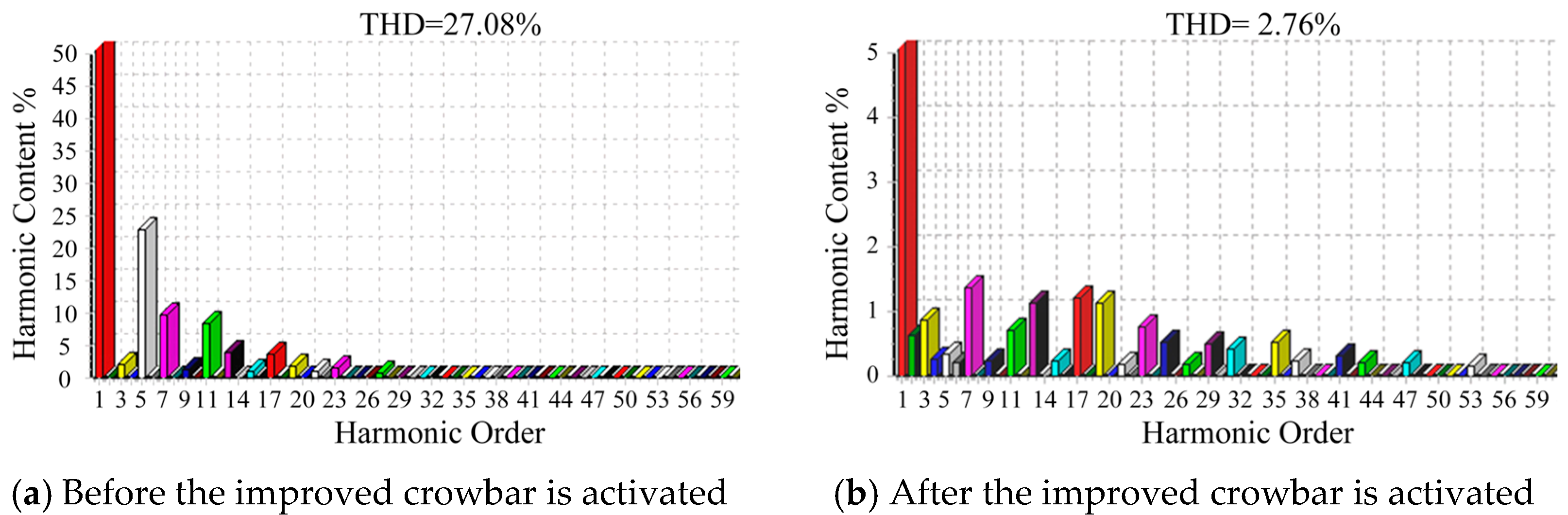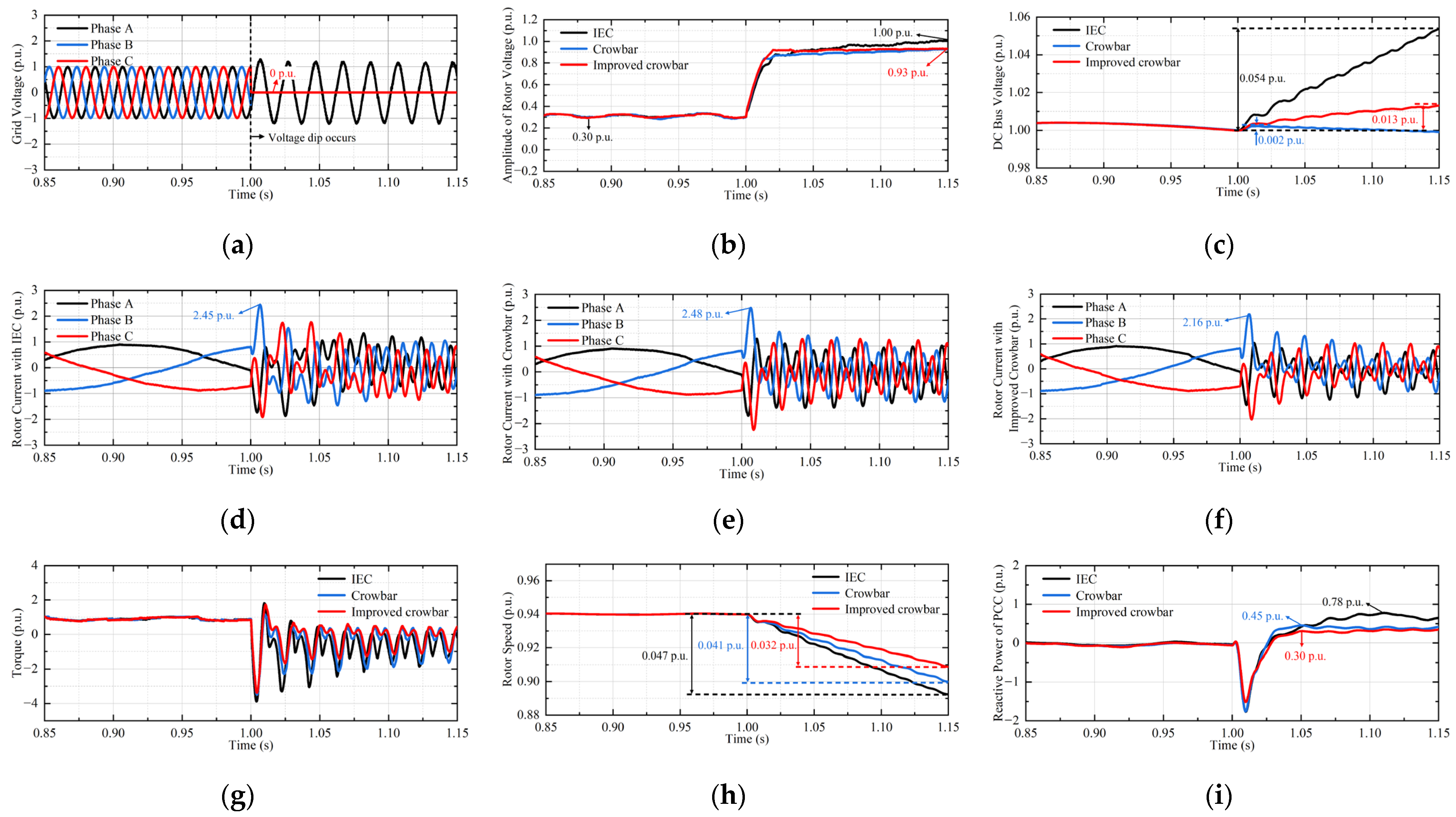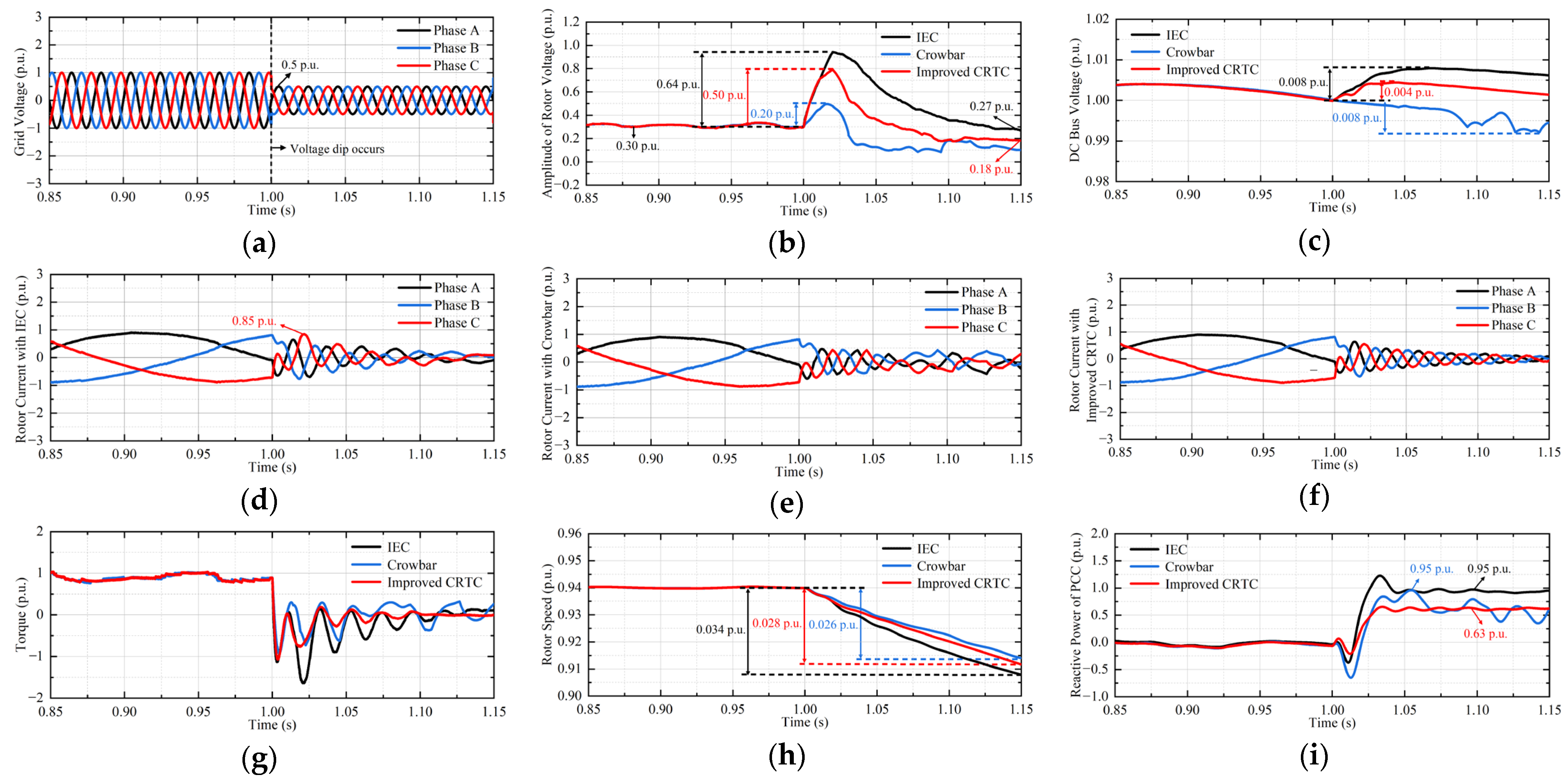 - A cooperative control strategy integrating the optimized CRTC and the enhanced active crowbar is established, enabling effective mitigation of deep voltage sag faults, while suppressing the negative-sequence current components and harmonic content at the PCC.