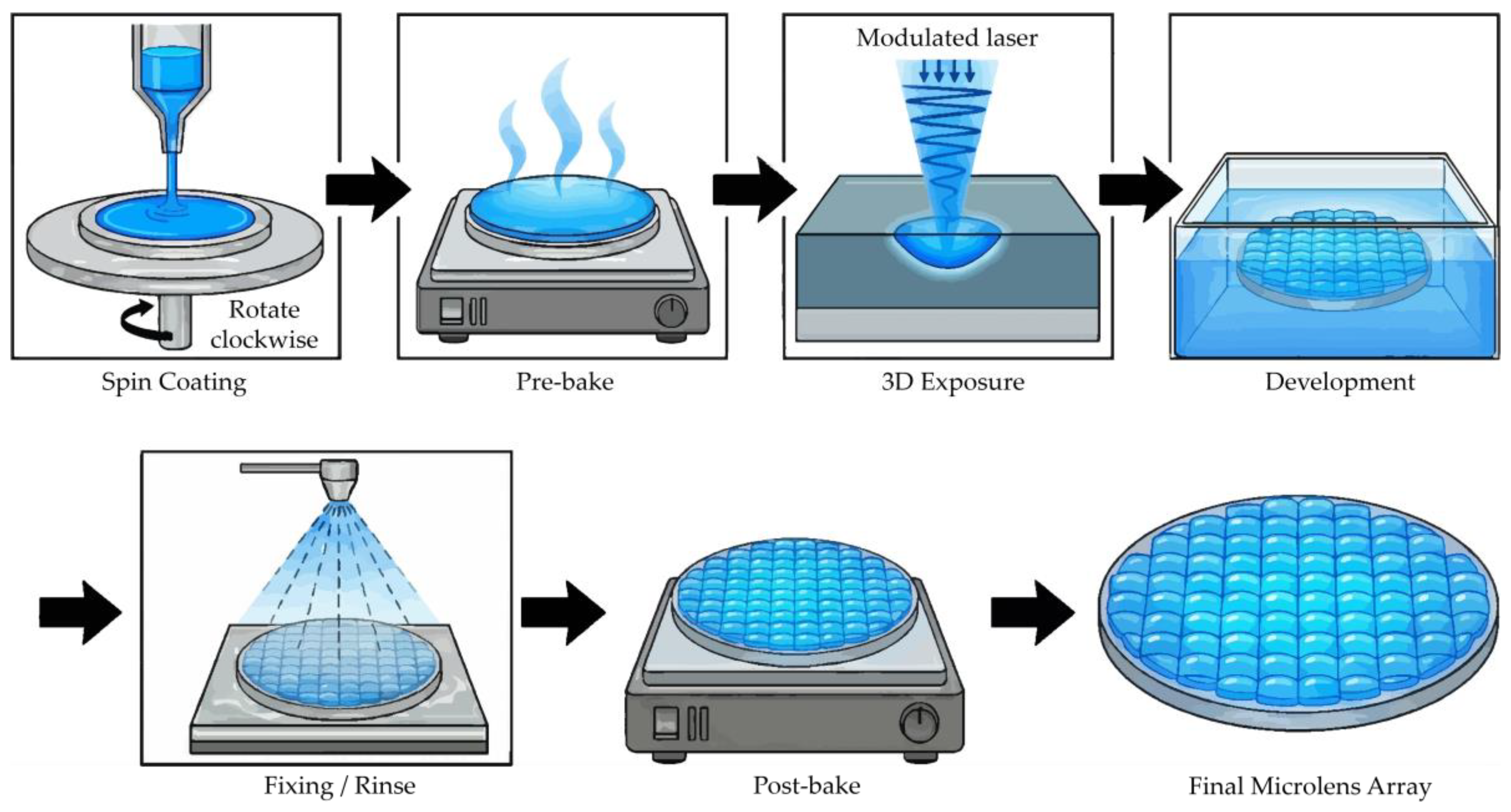 - Chao, C.M.; Hsieh, H.Y.; Nagarjuna, Y. A rapid method for fabricating and replicating microlens array structures. J. Micromech. Microeng. 2025, 35, 025001. [Google Scholar] [CrossRef]
