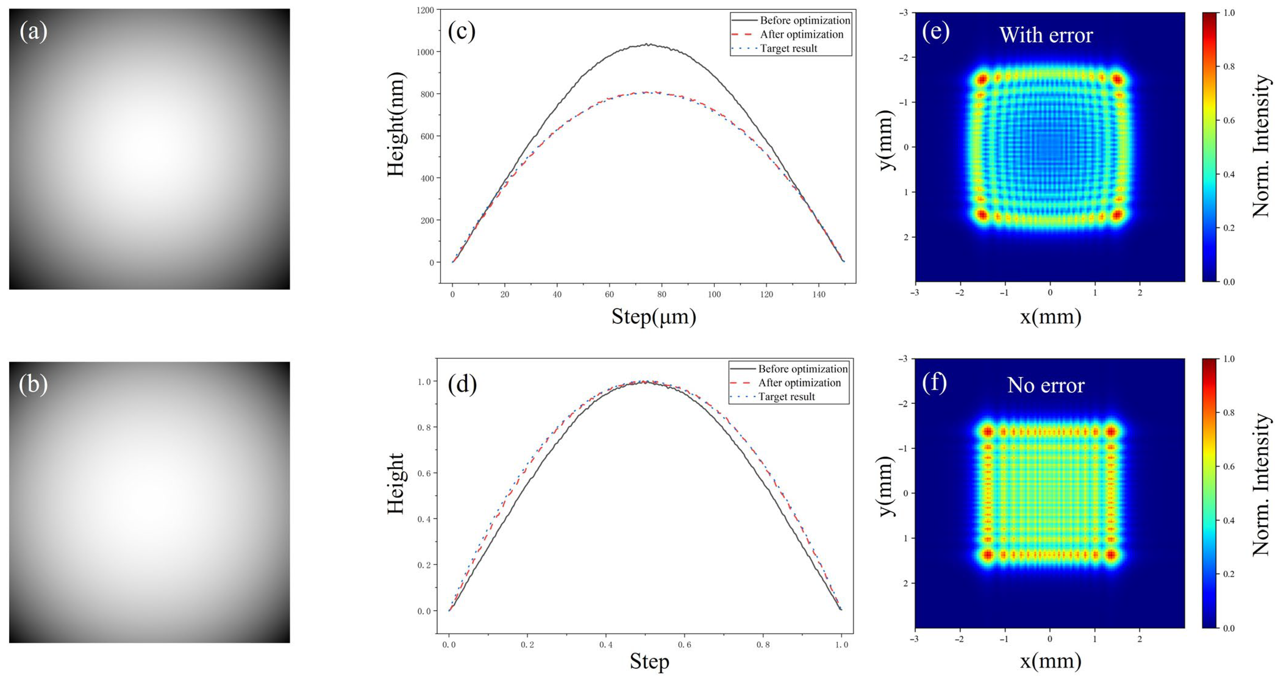 - Qu, W.; Gu, H.; Tan, Q.; Jin, G. Precise design of two-dimensional diffractive optical elements for beam shaping. Appl. Opt. 2015, 54, 6521–6525. [Google Scholar] [CrossRef] [PubMed]