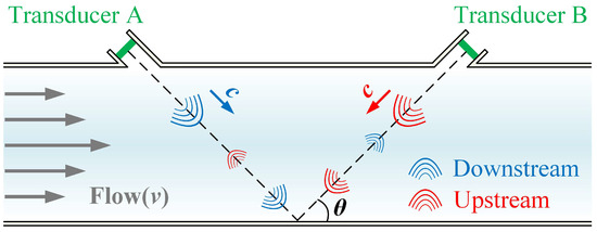 The principle of the transit-time USFM is schematically shown in Figure 1. The measurement system uses a pair of identical piezoelectric transducers (Transducer A and B), installed at a specific angle of inclination on a pipe [38]. During operation, Transducer A first transmits ultrasonic pulses along the flow direction (downstream), and the corresponding time of flight (ToF) is recorded as Tdown (s). Subsequently, Transducer B emits pulses in the opposite direction (upstream), with the ToF denoted as Tup (s). The basic principles are as follows: