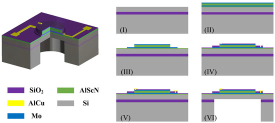 The 3D structure and fabrication of the PMUT. (I)–(VI) illustrate the main fabrication steps described in the text.