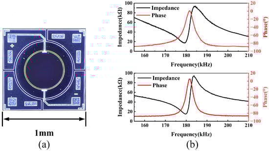 (a) The optical photo of the PMUT. (b) The measured impedance response of the PMUTs.