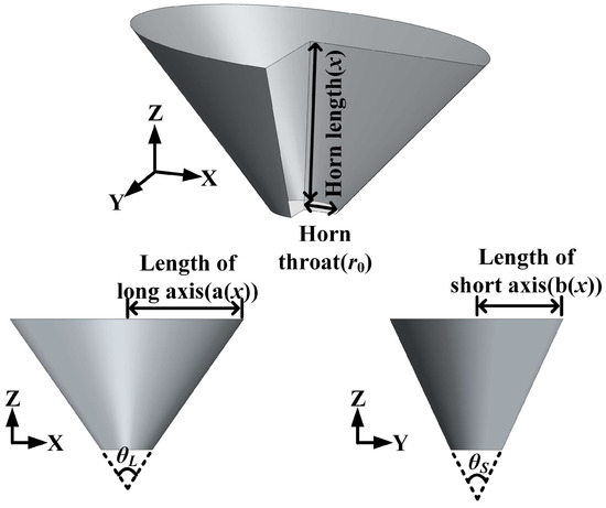 where a(x) and b(x) denote the major and minor axis lengths (m), while θL and θS denote the horn cone angle on the face where the long and short axes are located, respectively (°).