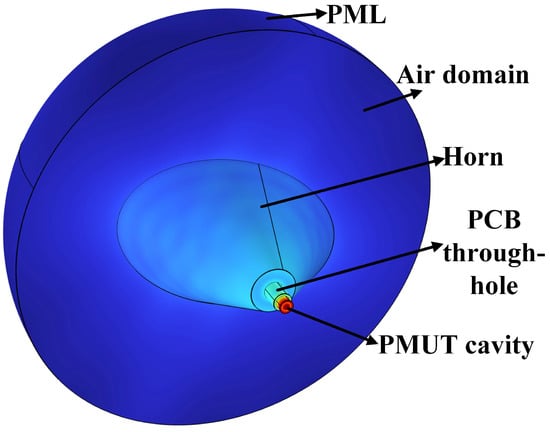 As shown in Figure 7, a 3D simulation model was established based on Finite Element Method (FEM) software (COMSOL Multiphysics 6.2, COMSOL AB, Stockholm, Sweden). The model adopts a layered modeling method, which contains the PMUT resonant cavity, PCB through-hole, horn structure, air domain, and Perfectly Matched Layer (PML) boundary conditions in turn. The diameter and vertical dimension of the PMUT resonant cavity are set to 0.6 mm and 0.4 mm, respectively; the PCB through-hole is parameterized to have a height of 1 mm and a diameter of 0.8 mm. To avoid obstruction to the acoustic wave propagation, the throat radius r0 was set to 1 mm. The horn height x was set to 5.1 mm to match the cylindrical transducer cavity height used in a commercial bulk PZT-based USFM (UG-YC4+, Zhejiang Weixing Intelligent Meter Co., Ltd., Hangzhou, Zhejiang, China), enabling engineering-level comparison. An acoustic excitation source with a frequency of 181.6 kHz was set in the PMUT resonant cavity, and the size and shape of the elliptical exit surface were regulated by controlling the variables and parametrically scanning the horn opening angles θL and θS. Eight angular gradients are constructed in the range of 10–80° in 10° steps to form 36 sets of (C82 + 8) parameter combinations for frequency domain simulations.
