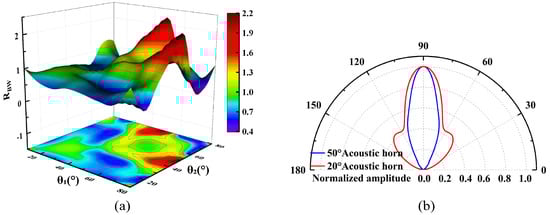 (a) Simulated RBW variation for different combinations of cone angles. (b) Normalized acoustic directivity for typical combination (θS, θL) = (20°, 50°).