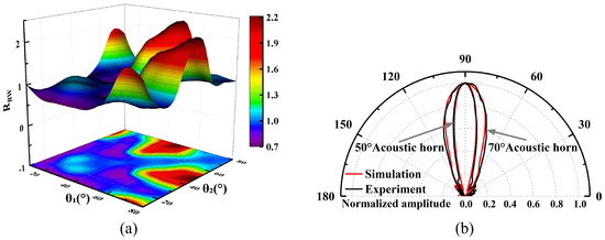 (a) Experimental RBW variation for different combinations of cone angles. (b) Normalized acoustic directivity for target cavity combination (θS, θL) = (50°, 70°).