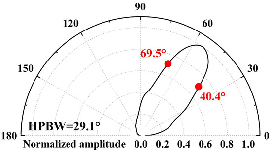 The directivity of ultrasonic transducers, defined as the variation in transmission response amplitude with azimuthal angle, is a critical performance parameter. As shown in Figure 4a, our experimental setup employed the following workflow: First, we mounted the PMUT on the central rotating shaft of a stepper motor and drove it using a burst signal (181.6 kHz, 5 Vpp, 20 cycles) generated by a waveform generator (Keysight Technologies, 33600A Series). Subsequently, a high-sensitivity capacitive microphone (CM16/CMPA-5V, Avisoft Bioacoustics, Glienicke/Nordbahn, Germany) captured acoustic field signals, which an oscilloscope (Keysight Technologies, DSOX2024A) transmitted to a PC in real time. This study employs a resonant cavity to emit ultrasonic waves, thereby increasing the transmitted acoustic pressure of a single PMUT element [43]. As shown in Figure 4b, the PMUT was bonded to a printed circuit board (PCB) using gold wire interconnects, with signals routed to external systems via the PCB. The front surface of the PMUT was encapsulated with a protective housing, enabling ultrasonic waves from the resonance cavity to propagate through the hole in the PCB. During testing, the stepper motor rotated from 0° to 180° in 1.8° increments, capturing acoustic pressure amplitude data at 101 spatial sampling points to reconstruct the full polar radiation pattern. To characterize the PMUT’s directivity, we used the half-power beamwidth (HPBW) (°) as the quantitative metric [44]. As shown in Figure 5, the −3 dB attenuation point corresponds to an azimuth angle ranging from 38.5° to 140.1°, and the HPBW is calculated as 101.6°. In addition to the normalized directivity patterns, an absolute acoustic reference was obtained by measuring the acoustic pressure generated by the PMUT under the same excitation conditions. At a distance of 1 cm above the device, the effective transmit sensitivity was approximately 0.43 Pa/V, which is provided as an engineering reference for the acoustic output level.