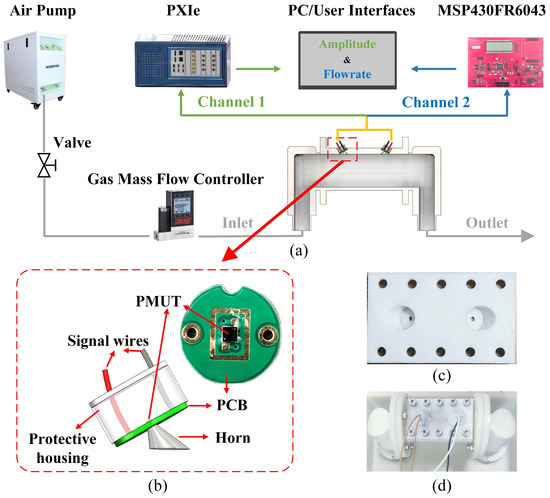 - Liu, T.; Li, Z.; Zhang, J.; Li, D.; Dou, H.; Wu, P.; Yang, J.; Zhang, W.; Mu, X. A Gas Flow Measurement System Based on Lead Zirconate Titanate Piezoelectric Micromachined Ultrasonic Transducer. Micromachines 2024, 15, 45. [Google Scholar] [CrossRef]