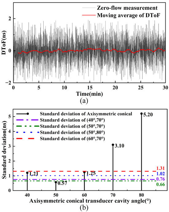 To evaluate the effect of cavities with different angles on measurement accuracy, zero-flow experiments were performed at room temperature using transit-time USFM. Under zero-flow conditions, random errors of the measured DToF can reflect the SNR of the system. Each experiment lasted 30 min with a 0.5 s sampling interval to ensure adequate data density. Figure 14a demonstrates the DToF measurements of the (50°, 70°) conical cavity under zero-flow conditions. Experimental data demonstrate that individual DToF measurements exhibit fluctuations within ±2 ns, with a standard deviation of 0.66 ns, indicating excellent consistency between the two PMUT transducers. By setting a 1 min time window, the fluctuation amplitude of the moving average converges to within ±200 ps. Further analysis through Figure 14b, which compares measurement stability between the two cavity types at different cone angles, reveals that the axisymmetric cavity achieves its optimal standard deviation of 0.57 ns at a 50° cone angle, whereas the non-axisymmetric cavity attains peak performance at the combined angles (50°, 70°). Considering both beam broadening characteristics and acoustic intensity gain, the (50°, 70°) non-axisymmetric cavity is finally selected as the optimal design.