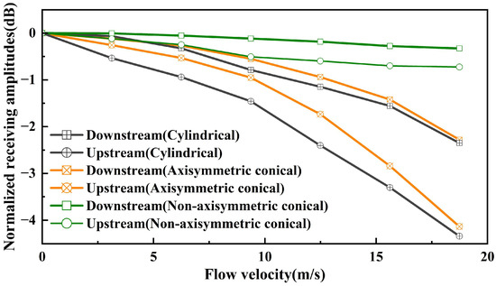 Figure 15 shows the normalized amplitude (dB) variations of received signals along downstream and upstream propagation paths for three groups of USFMs across the 0–18.74 m/s flow velocity range. Experimental data reveal that as flow velocity increases, all transducers exhibit decreasing signal amplitudes in both flow directions, with upstream paths demonstrating significantly higher sensitivity to velocity variations compared to downstream paths. Further analysis demonstrates a strong negative correlation between beamwidth and velocity sensitivity: narrower beamwidths are susceptible to flow velocity. During upstream propagation, Control Group 1, which has the narrowest beamwidth, exhibits a maximum acoustic pressure level attenuation of 4.34 dB, whereas the experimental group, with a broader beamwidth, shows only 0.72 dB attenuation. Control Group 2, whose beamwidth lies between that of the experimental group and Control Group 1, displays a maximum signal attenuation of 4.13 dB, exhibiting intermediate characteristics corresponding to its beamwidth.